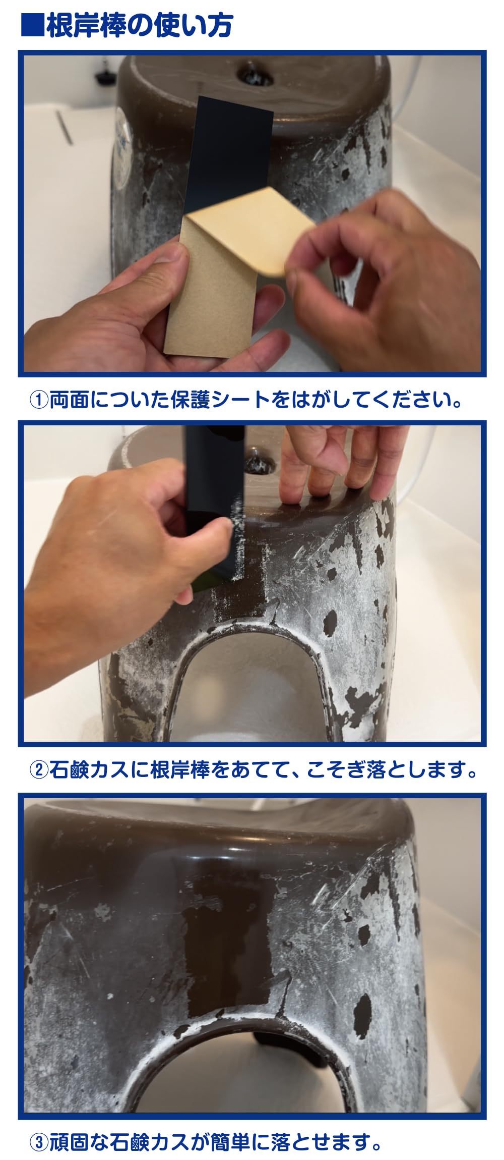 ■用途:浴室の石鹸カス除去 ■説明:浴室のカチカチに固まったフィルム状の石鹸カスが驚くほどよく取れる! 埼玉県でハウスクリーニング業を営む根岸さんが開発した特許取得のお掃除グッズ。 お掃除業界でも愛用者多数。 ■使用前の準備:両面についた保護シートを外してから使用します。 ■使用方法:固まった石鹸カスに根岸棒を優しく当てて、こそぎ落とすように使用してください。 ■使用上の注意:光沢のある素材や黒色の素材に使用すると、キズが目立つことがあるので注意してください。キズが心配な場合は、目立たないところで試してから使用してください。絶対にキズをつけたくないところには使用するのを控えてください。 角やエッジは鋭くなっているので注意してください。小さなお子様の手の届くところに置かないでください。使用後はしっかり洗い流し、乾燥させて保管してください。廃棄する際は各自治体の定める方法に従って処理してください。
