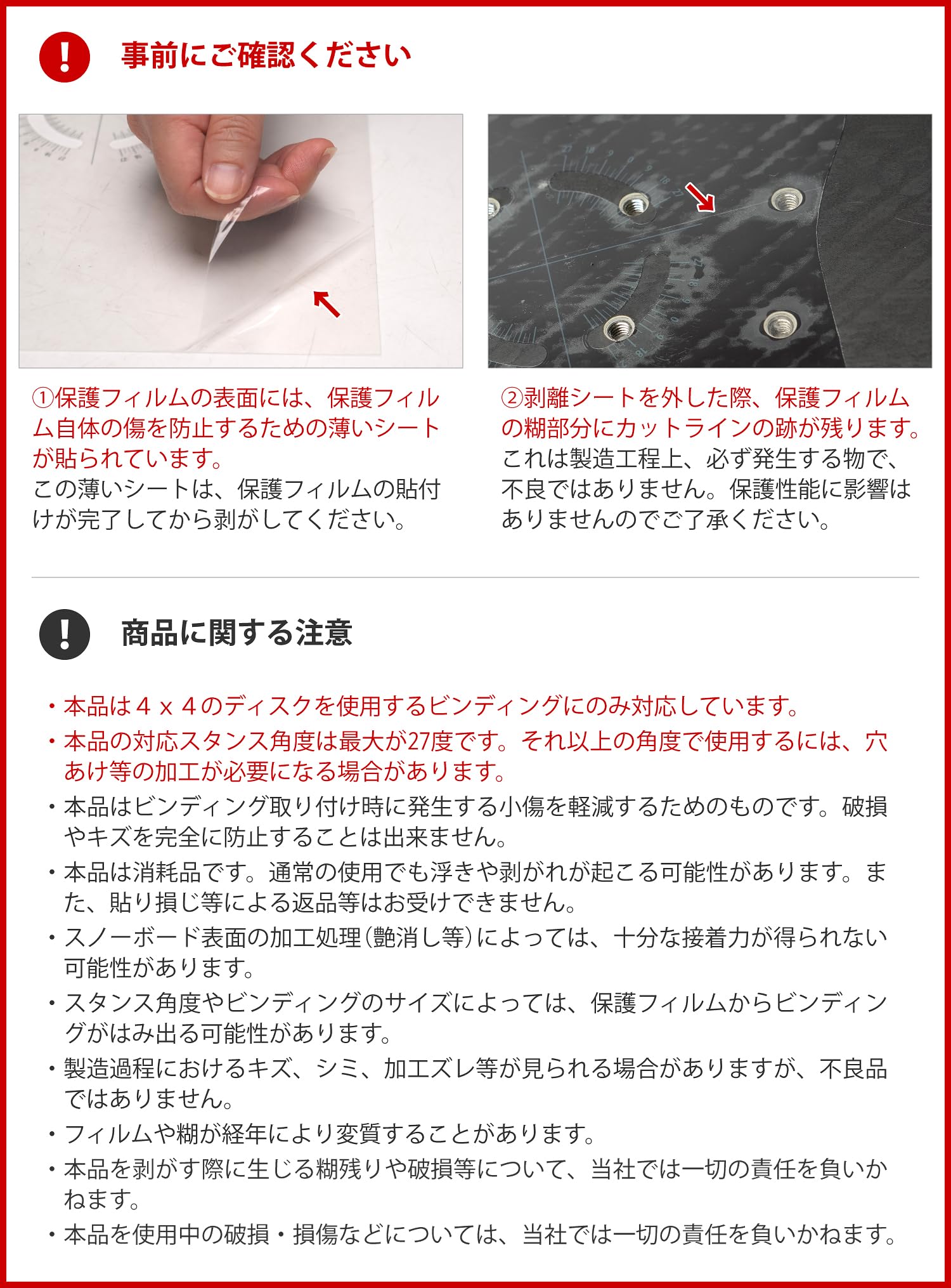 ビンディング取付時に発生する傷つきから、スノーボード表面を保護するスノーボードプロテクションフィルム。