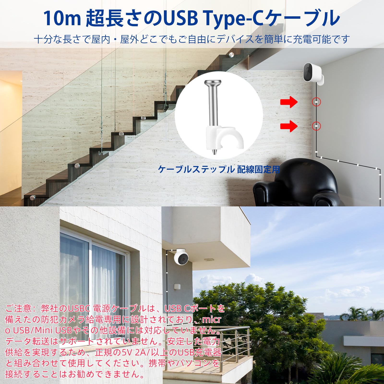 幅広い対応 防犯カメラ 充電ケーブル:USB Type-Cポートを持っている電子機器に給電・充電に使用できるのusb c ケーブル 。長さが5m超長、対応XiaomiMi カメラ 2K/Mi Mi 360°家庭用 スマートカメラC400/対応EZVIZ/対応Nest Cam /対応Imou/対応Yi Camera/対応Arlo Q/Furbo ドッグネットワークカメラXBOX コントローラー/ドライブレコーダー、スイッチ、スマートフォン、ノートパソコン、タブレットなどのUSB Type-C 端子機器向けに給電用適合です。そして、ケーブルステップル付属し、非常に使いやすく、片付けて保管しておくのがとても便利です。(ご購入前ご愛機の接続ポートを確認して下さい。)