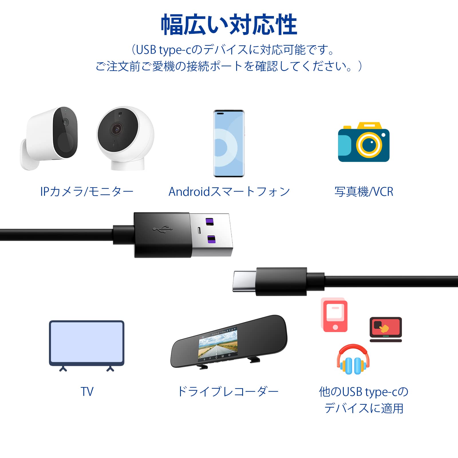 対応機種:TITACUTE usb-c ケーブルは、対応XiaoMi カメラ2K/miスマートカメラC400、対応wansview、対応EZVIZ CP1/C6C/CB2防犯カメラ、対応Nest Cam、対応YESKAMO,対応Wyze Cam Pan、対応アイモウ(Imou)、対応Furbo ドッグカメラ、対応Yi Camera Arlo Q, 対応Netvue、対応Blink Mini、対応Xbox seriesコントローラー、対応GoPro Hero 、ドライブレコーダーなど他のUSB Type-C端子あるの周辺機器やナビ、デジカメ、usb扇風機/デスクライト、モニターとPC接続に電源供給使用可能。