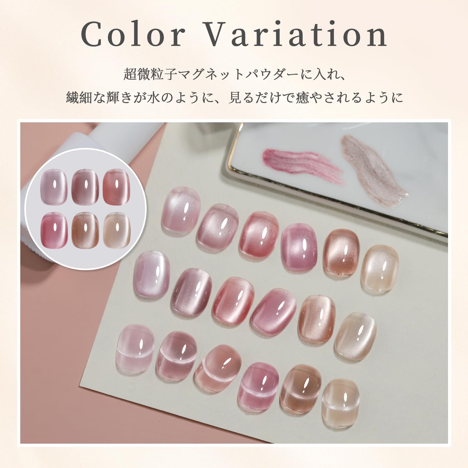 【ナチュラルピンクマグネット 】シアーカラーで柔らかいベースカラーと超微粒子のマグネットパウダーで水々しいマグネット輝きを表現します。シンプル~華やかなデザインまで幅広くお使いいただけます。