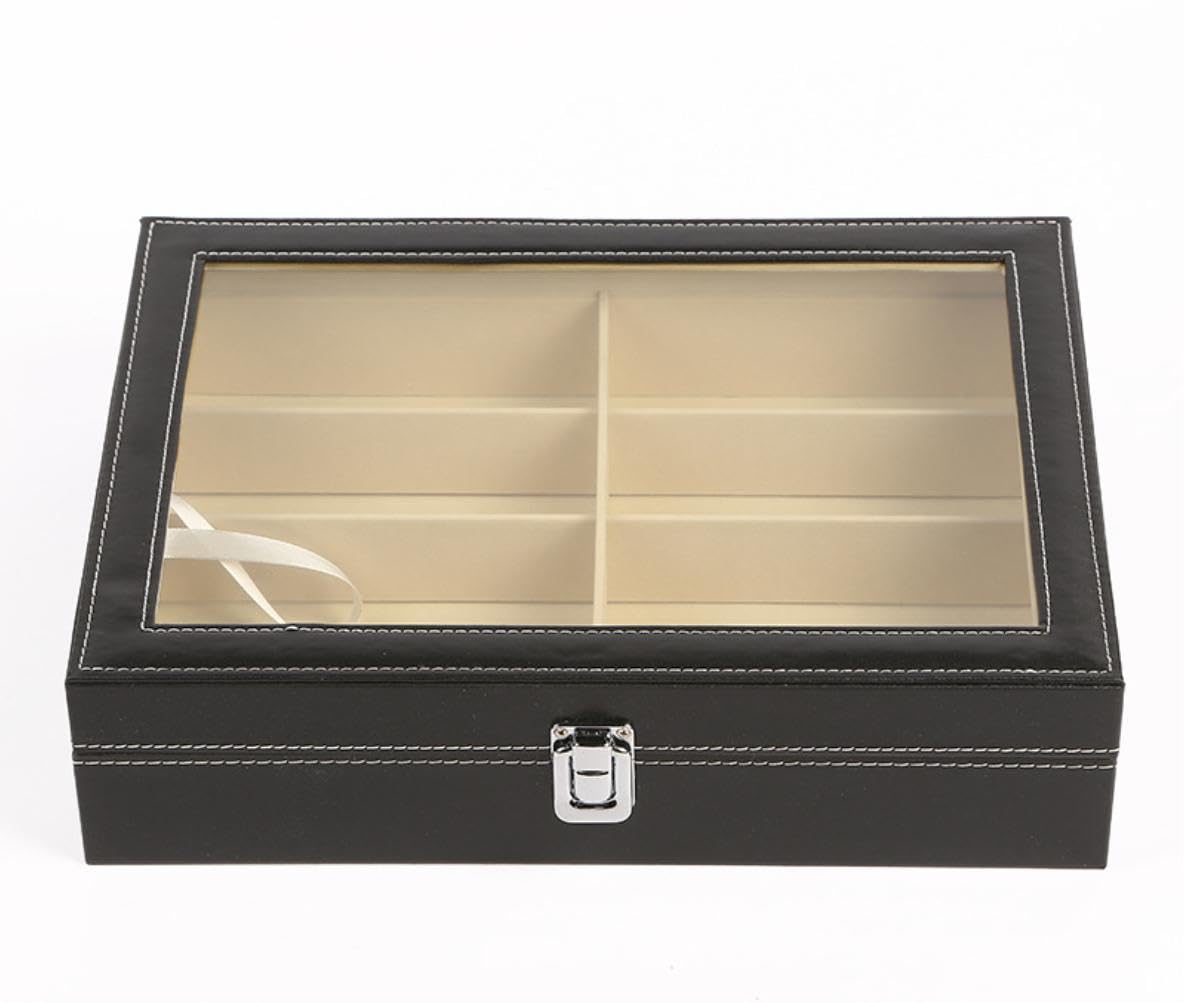 メガネはもちろん、アクセサリーやジュエリーなども活用できます 素材:合成皮革+中密度繊維板+高透明性のガラス。それに、錠は金属製で、光沢度が高くて高級感が溢れます。