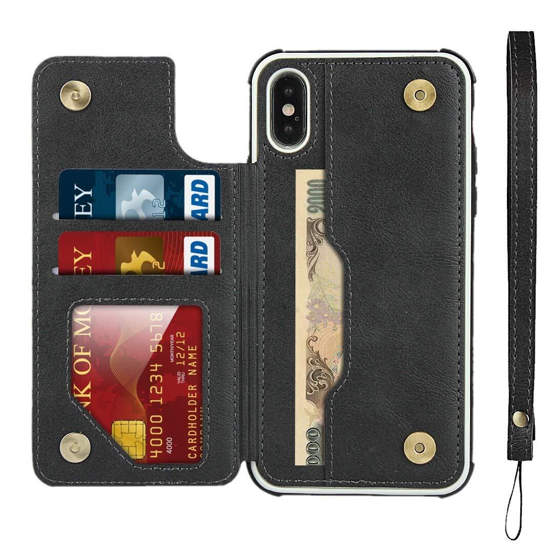 Pelanty for iPhone X ケース iPhone XS ケース縄掛け 5.8インチ 背面 手帳型 PUレザー IC カード収納 軽量 スタンド機能 ボタン磁気 多機能 アイフォンX/XS スマホケース 耐衝撃 滑り防止 全面保護 ストラップ 携帯カバー-ブラック