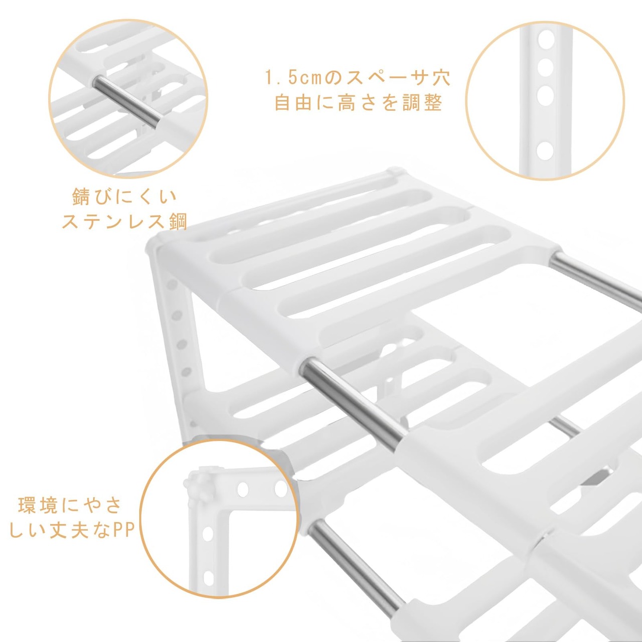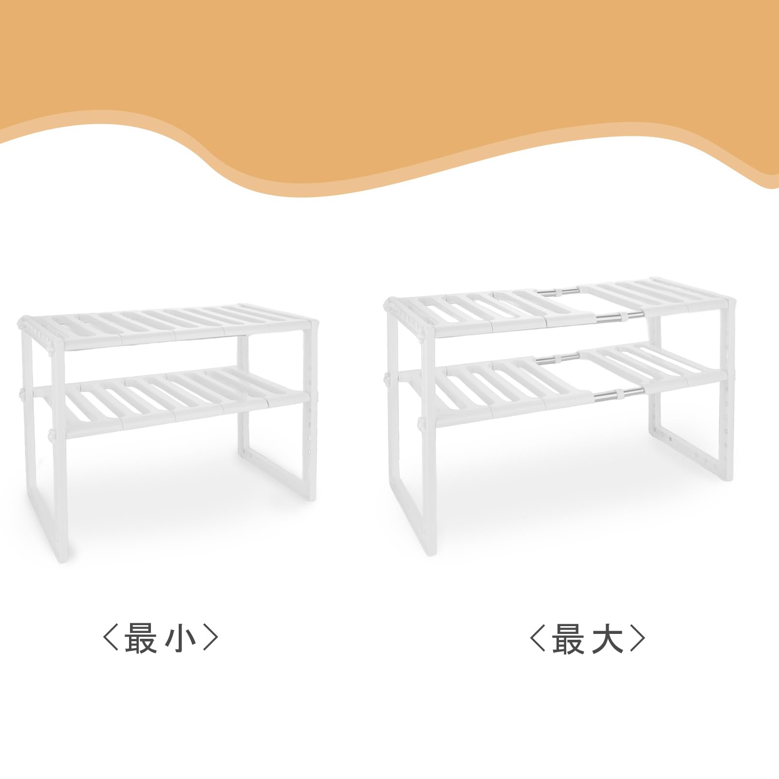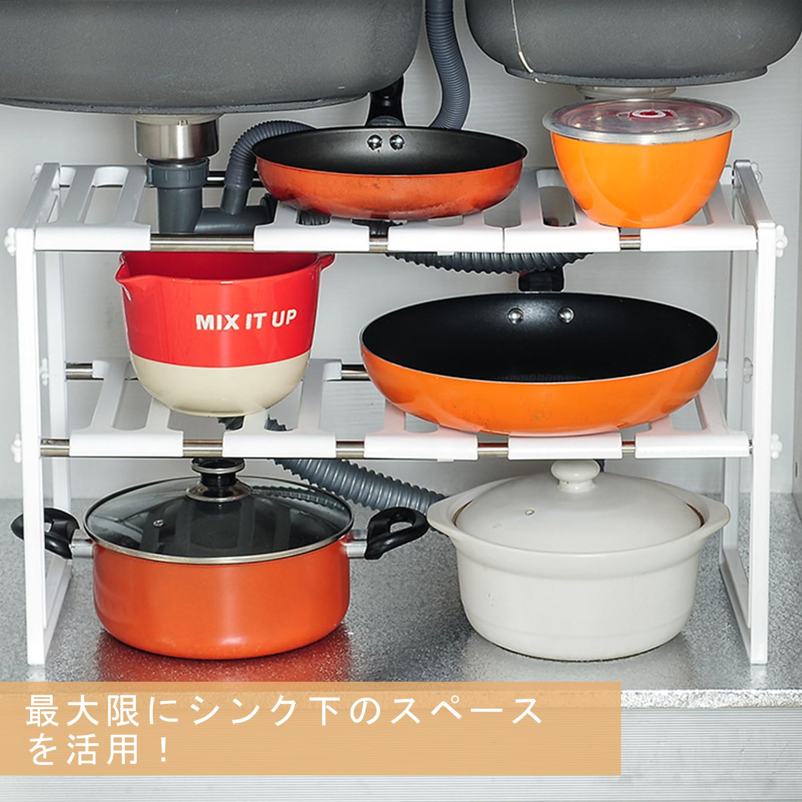 商品内容:シンク下 収納 2個セット サイズ:40-68cmx26.5cmx39cm 重量:1.3kg 素材:ポリプロピレン樹脂(PP) +ステンレス 耐荷重:12kg(一段あたり6kg)