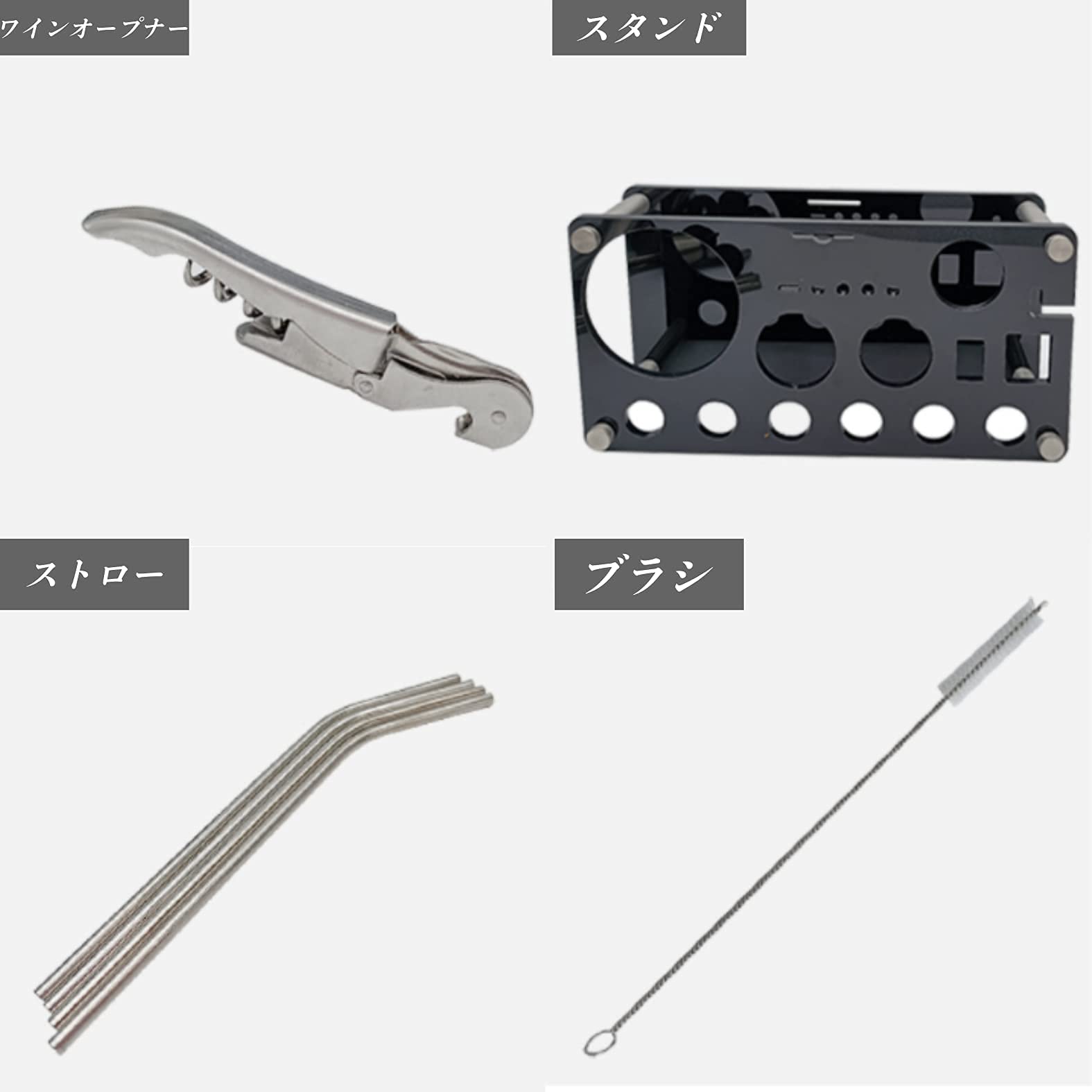 付属コンポーネント モヒートペースト, ストレーナー, ワインストッパー, ポアラー, バースプー, アイストング, シェイカー, ワインオープナー, メジャーカップ, トング, ブラシ, バースプーン, スタンド