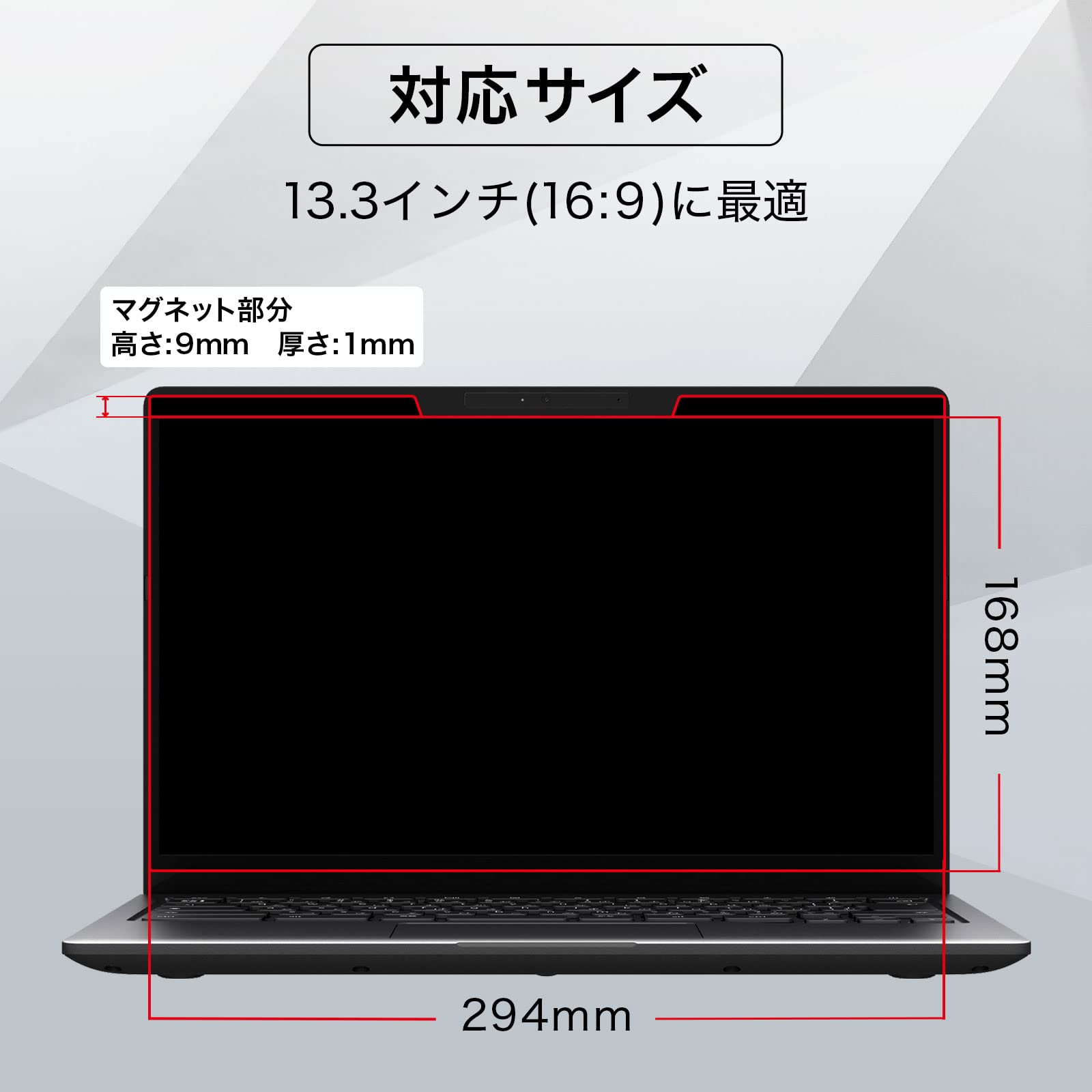【対応機種】 13.3インチ 縦横比16:9 寸法:フィルター部分のみ 294×168mm , 上部のマグネット部分は約9mm 。画面とベゼルの高低差により画面がややぼやけて見える場合が御座います。 マグネット付着位置に磁力に反応するセンサーが内蔵されている一部の機種はご利用頂けない場合が御座います。付属のマグネットを使用し、お確かめの上ご利用下さい。