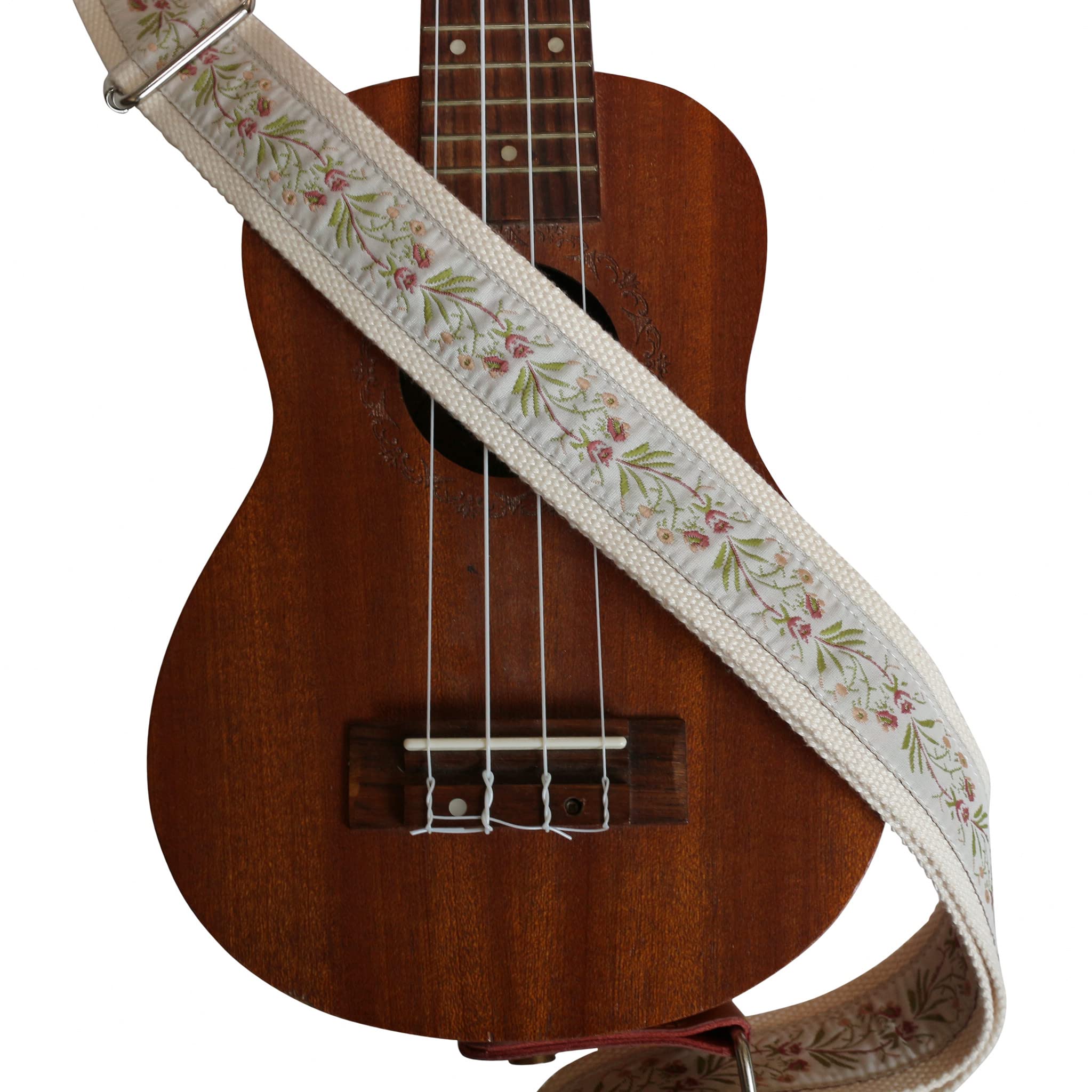 MUSIC FIRSTオリジナルデザインのビンテージフローラル刺繍入り本物のレザーウクレレストラップ、ウクレレショルダーストラップ、MUSIC FIRST本物のレザーストラップロッカー付き / ビンテージスタイルの上品なクリーミーホワイトのフローラル柄のコットンシェル生地/本物のレザーストラップエンド / 素材:コットン(表)+ 本物のレザー+ コットン(裏)+ 金属アクセサリー / 幅:1.5インチ(3.8cm);長さ:48インチ〜27.5インチ(122cm〜70cm)調節可能;厚さ:0.13インチ(0.33cm)/ MUSIC FIRST ウクレレストラップロッカー 1個 (価格:$7.99相当)+ゴールデンカラーのストラップナイル 1個を無料でプレゼント(写真のウクレレは含まれていません)