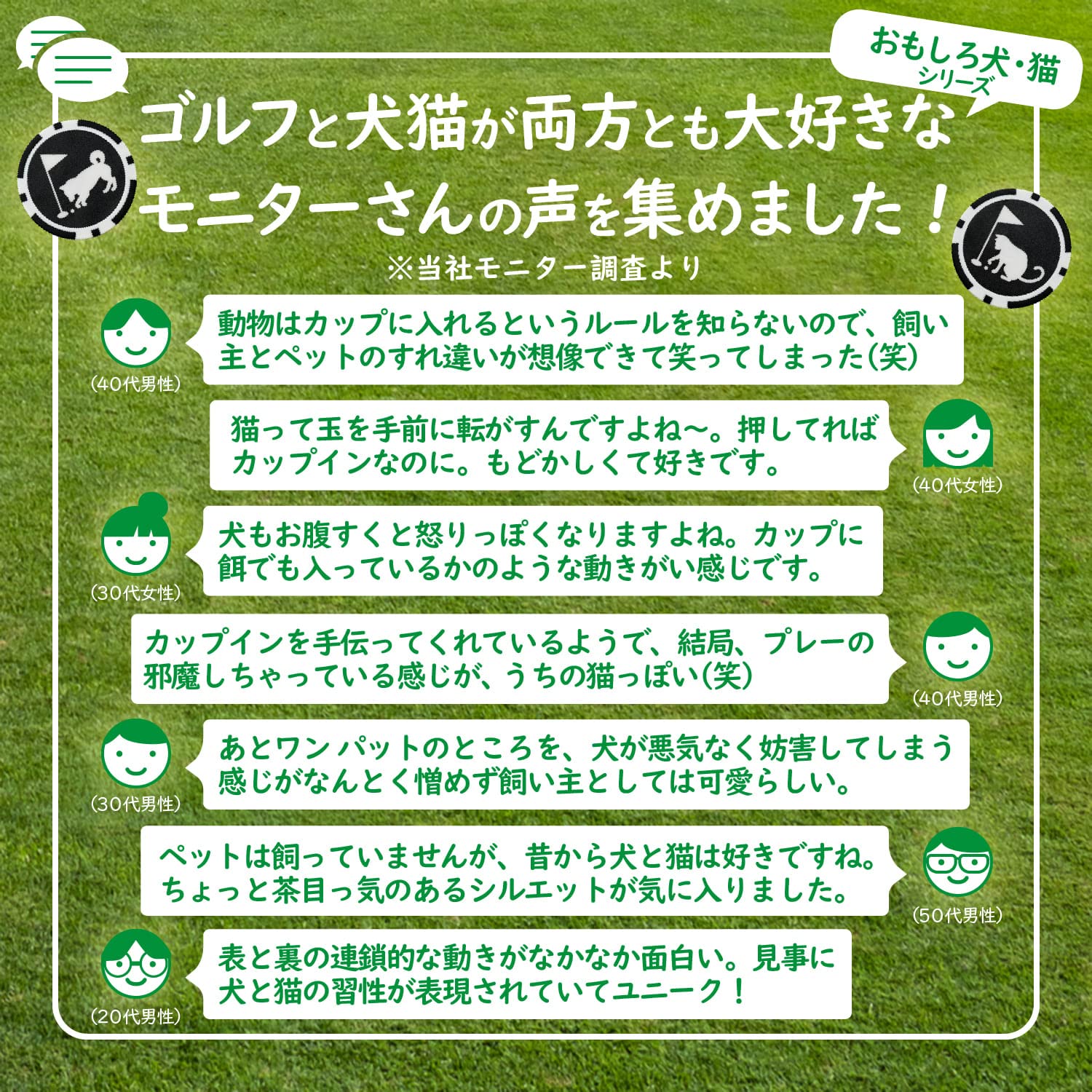 犬猫のデザインは多くの皆様に愛されるデザインですので、コンペの景品や参加賞にも喜ばれます。父の日やプレゼント、ギフトにもユニークなラウンドアイテムです。