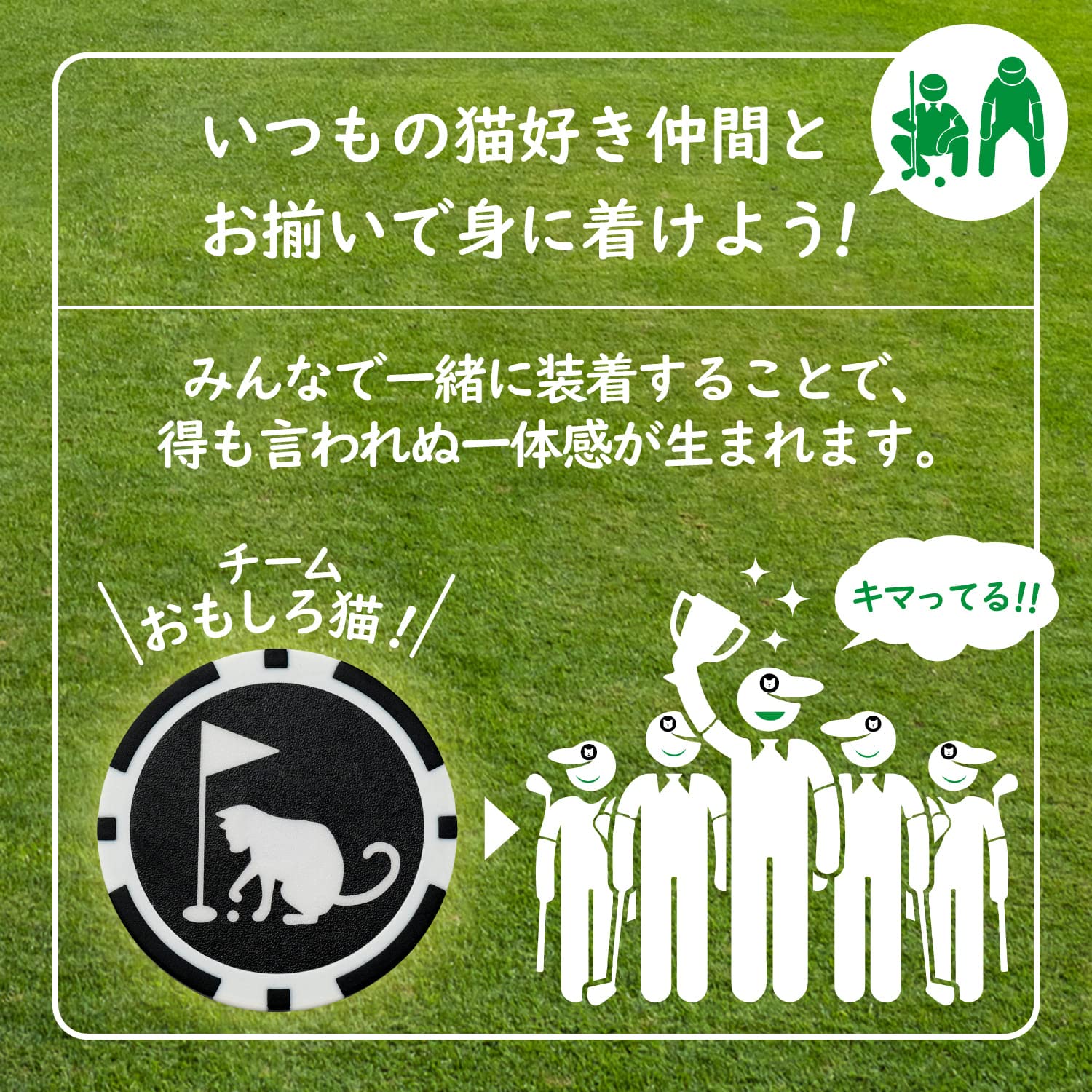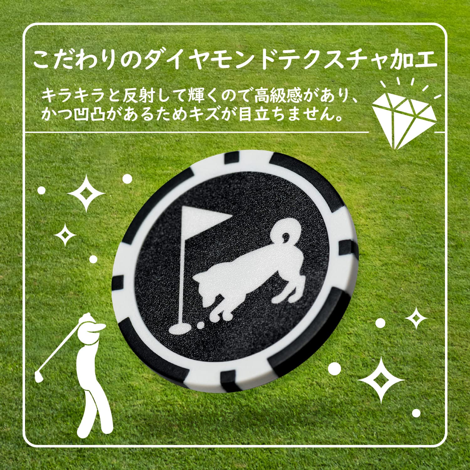 犬猫をモチーフにしたリバーシブルタイプのゴルフマーカー。スタイリッシュな「おしゃれ犬・猫」とユニークでおもしろい「いたずら犬・猫」の2タイプをご用意しました。仲間や後輩の緊張を和らげたり、ちょっとした話題づくりにも一躍買うラウンドアイテムです。裏返すだけで2タイプのデザインをお楽しみいただけますので、気分によって、簡単に使いわけることができます。そして、たまにあるのがウケ狙いの空振り。小さいマーカーでは最後まで気付かれなかったというご経験も多いのではないでしょうか。本製本はカジノチップ風の大きめサイズ設計ですので、ラウンド仲間にしっかり伝わるインパクトあるデザインを目指しました。ラウンド中はウケもパッティングもしっかり決めたいですね!また、ハットクリップ式のマグネット台座が標準装備なので、帽子やサンバイザーにセットしてすぐにご使用いただけます。さあ、「おもしろ犬・猫」ゴルフマーカーでラウンドを盛り上げましょう!