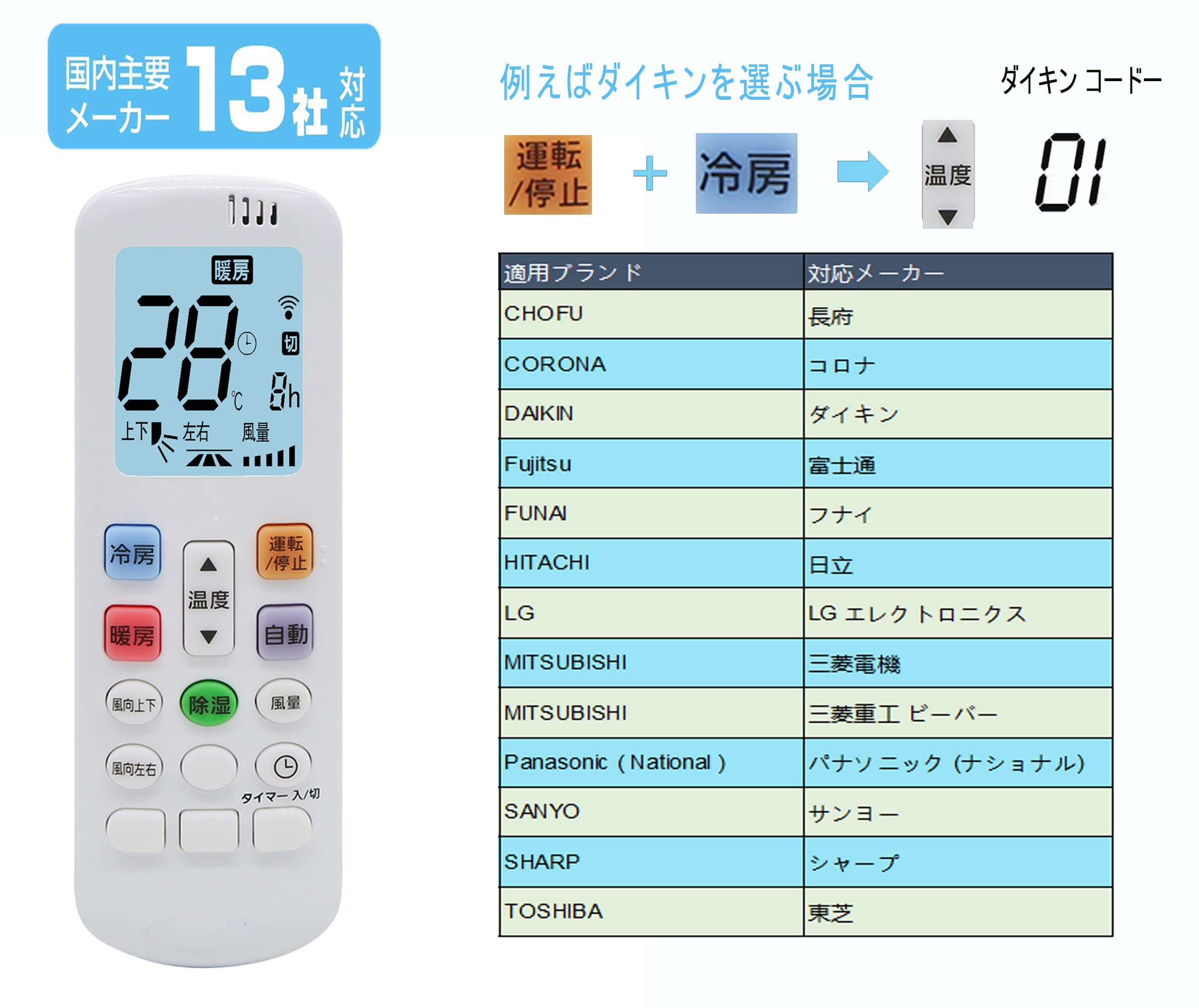 この 汎用リモコン エアコン 対応13メーカー/ブランド,簡単設定 「運転/停止+冷房」または+「暖房・除湿・自動」ボタン(詳細は説明書をご覧ください)を押し、温度ボタンでを上下に変えるだけで、13種類の空調ブランドを切り替えられます。