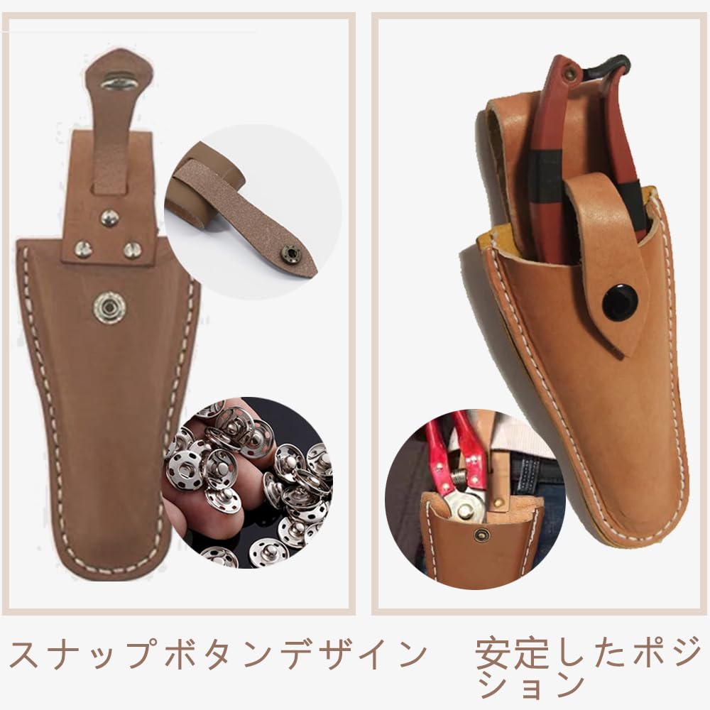 【デザイン】剪定はさみケースの開口部はスナップボタンでしっかりと固定されており、バックルが開かず、工具が落下したり紛失したりする心配がありません。ベルトに簡単に取り付けられ、長時間の使用でも快適な装着感を提供します。さらに、ホルスターのデザインは使いやすさを重視しており、スムーズな取り出しと収納が可能です。