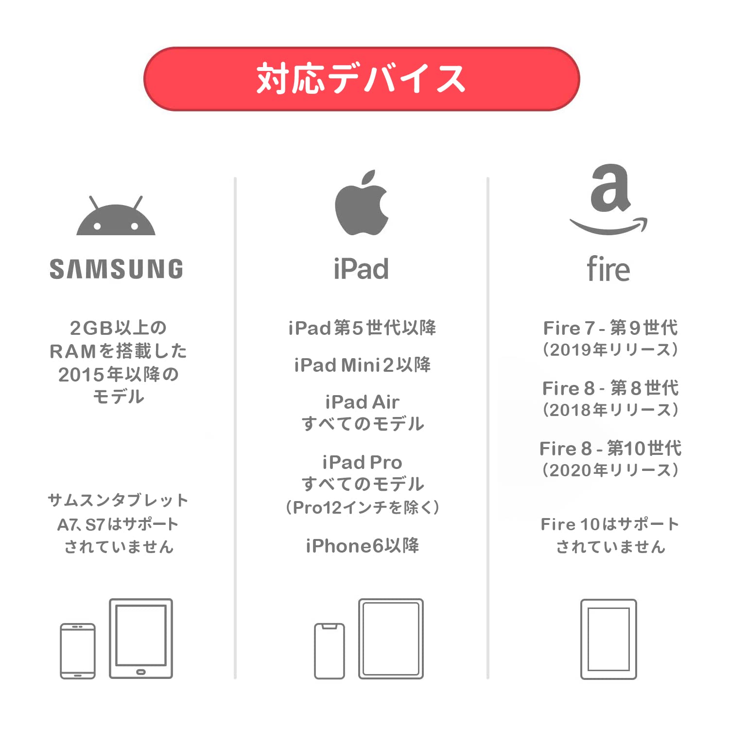 対応デバイス - iOS:iPad 第5世代以降、iPad Pro全モデル(Pro 12.9インチを除く)、iPad Air全モデル、iPad Mini 第2世代以降、iPhone 6以降|サムスン製デバイス:2015年以降、2GB RAM以上 [Samsung Tab A7、A 10.5、S7、S7+はサポート外] | - Fire 7(第9世代2019年リリースのみ)、Fire 8(第8世代2018年リリース、第10世代2020年リリース); [Fire 10はサポート外] 。