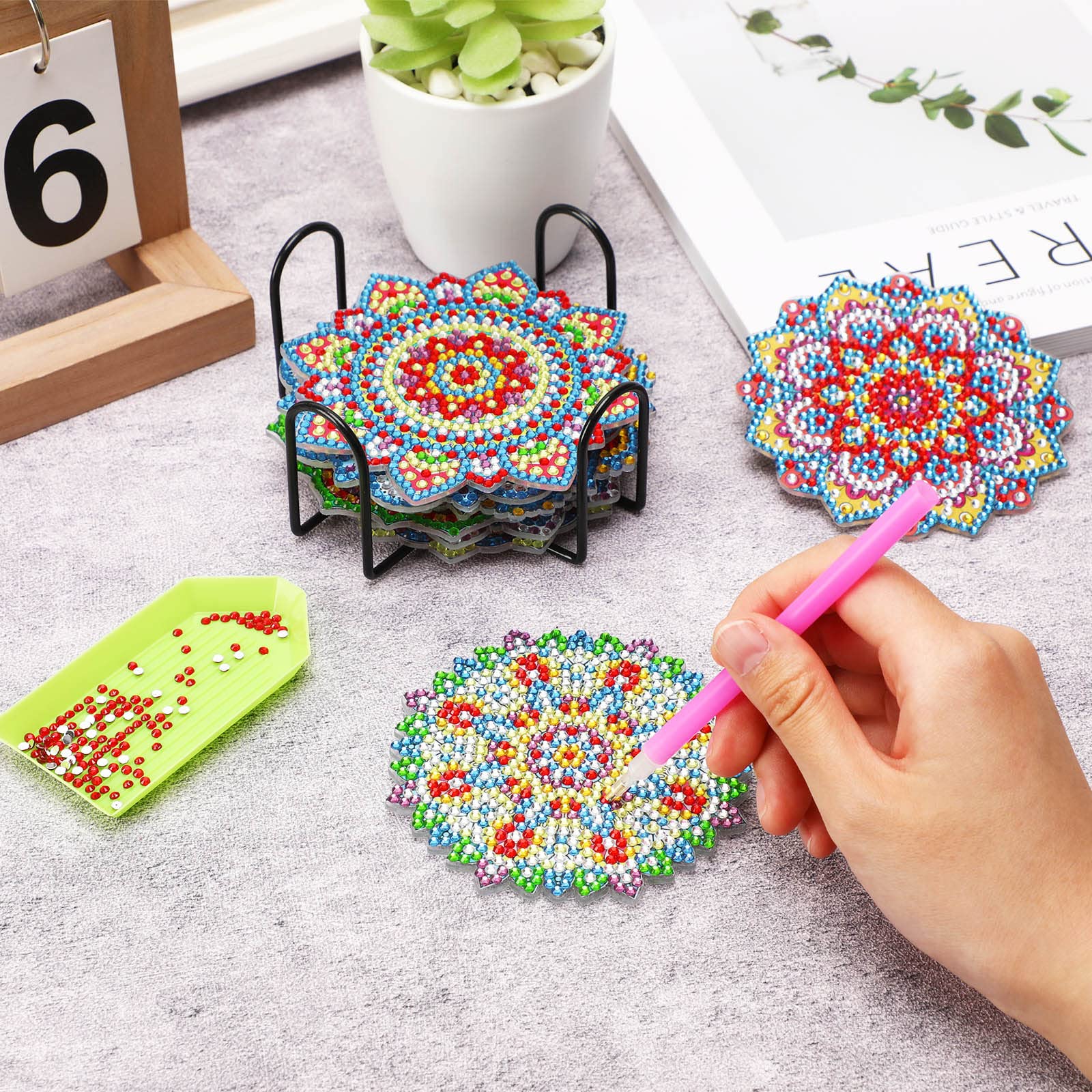 【保管に便利】ダイヤモンドアート キットには、スチール製のカップホルダーがあるので、使わない時にコースターをカップホルダーに収納して、邪魔になりません。