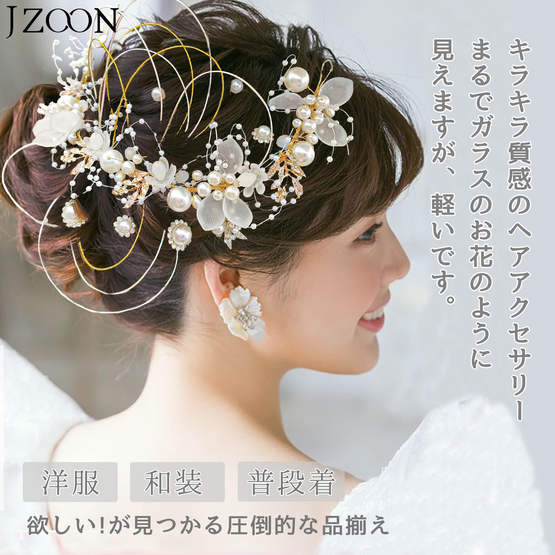 【ハンドメイド】職人が一点一点丁寧な手作業で仕上げたハンドメイドアイテム。留め具はUピン仕様ですので、留め具はUピン仕様ですので、ヘアスタイルにあわせて簡単に取り付け可能です。ワイヤーで角度等自由に曲げられるので、サイドにもバックにお付け頂いても映えます。