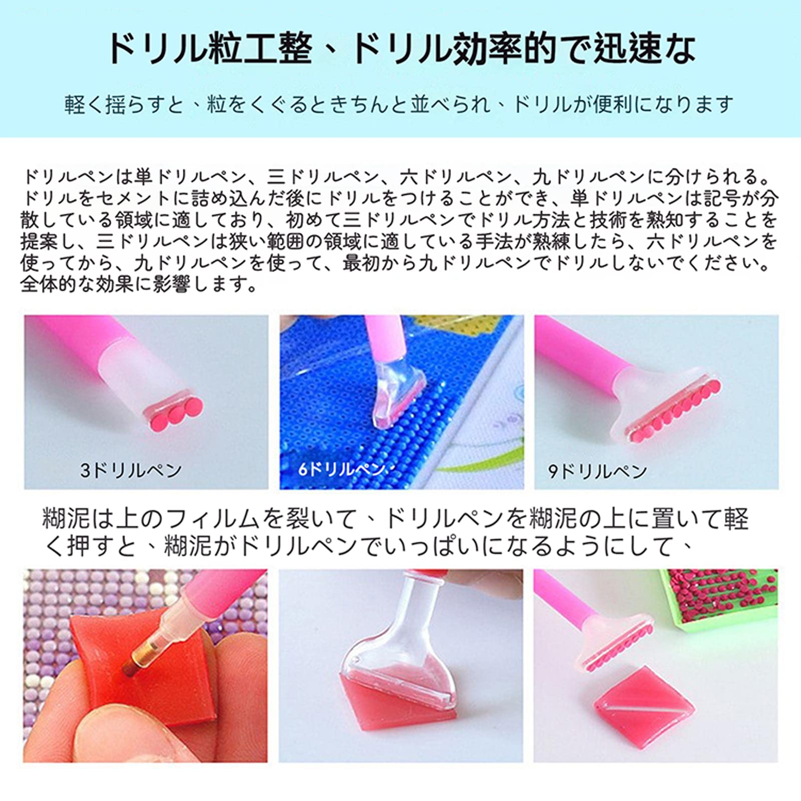 【高効率】4つの異なるタイプのダイヤモンドペイントツールペンが付いており、同じ色のダイヤモンドを大面積に貼り付けることも、小面積に貼り付けることもできます。好みに合わせてダイヤ貼りの効率を上げていきます。