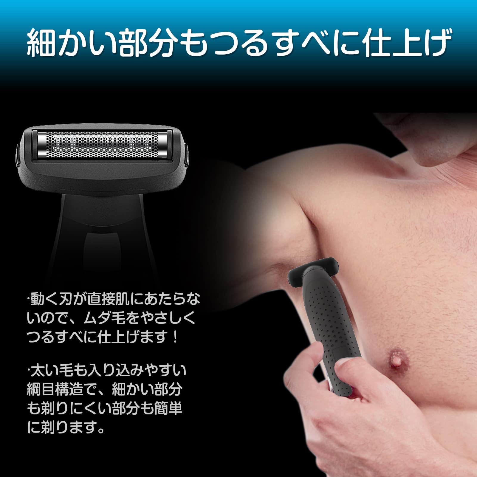 【肌に優しいボディシェーバー】新型男性専用ムダ毛シェーバーは抗アレルギー性精鋼ステンレス外刃と肌に直接触れず往復式内刃を採用しております。刃の先端が尖っていないから、肌あたりやさしい、炎症やダメージ起こしない、汗腺や肌を傷つける心配もありません。敏感肌などの肌が弱い方にも安心してご使用できます。