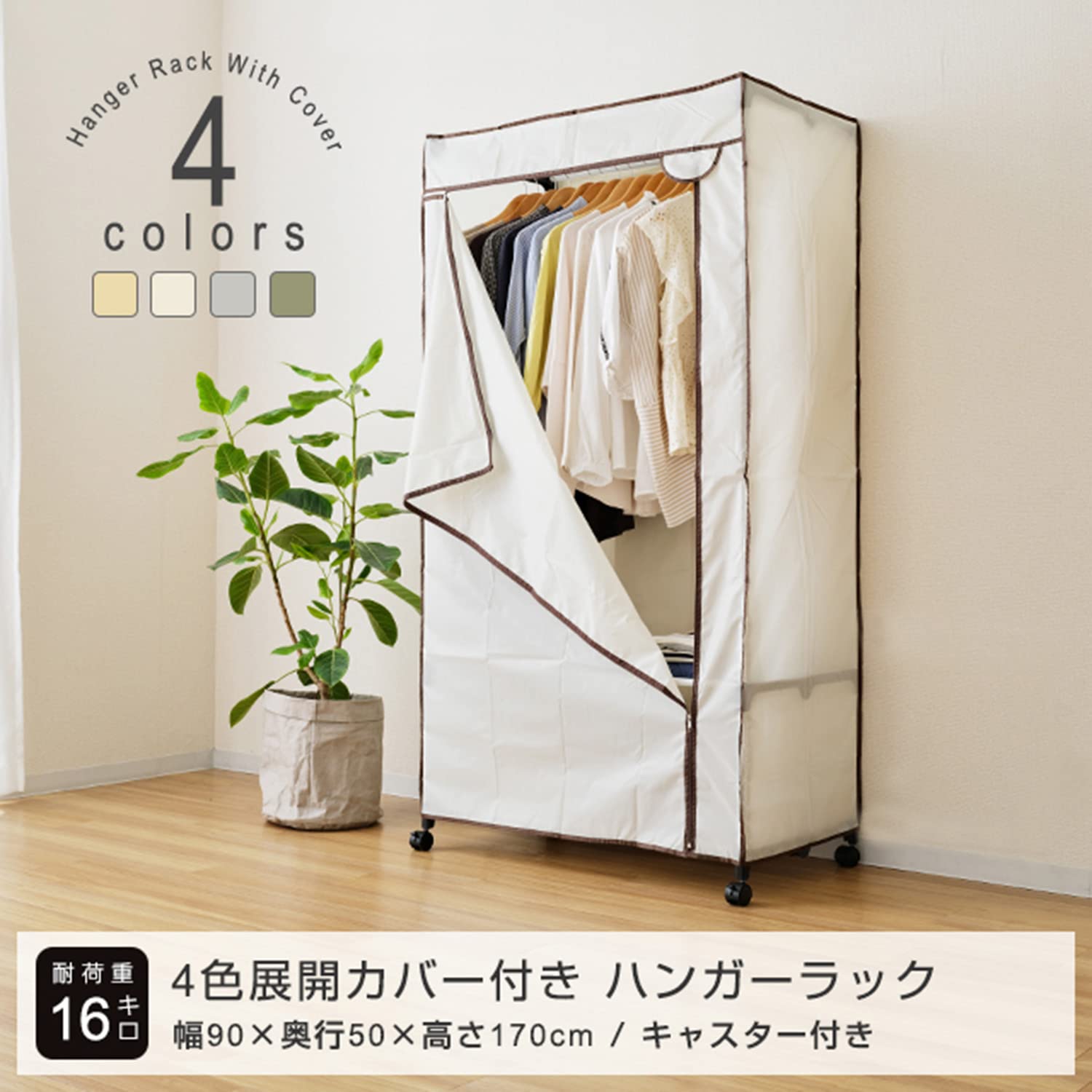 ドウシシャ ハンガーラック カバー付き ワードローブ 大容量 頑丈 全体耐荷重16kg キャスター付き 棚 収納付き 白 アイボリー 幅90×奥行50×高さ170cm 洋服収納 パイプハンガー 洋服掛け 衣類 衣装 クローゼット HRC-9050