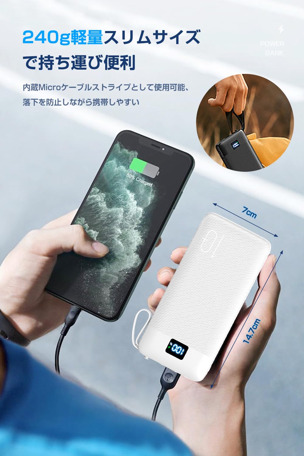 【3種類のケーブル内蔵・5台も同時充電】多機能 モバイルバッテリーのはmicroUSB、iPhone用とtype-Cなど3規格出力ケーブルが内蔵されます。様々なケーブルを持ち歩く必要がなく、各タイプのデバイスにも対応出来ます。更に、Type-C出力/入力ポート、USB-A出力ポート搭載して、合わせて最大5台の機器を同時に充電することができる携帯充電器です。手軽にスマホを充電できる為に、内蔵ケーブルがストラップに変身でき、片手で充電しながらスマホも使用可能、持ち運び超便利です。