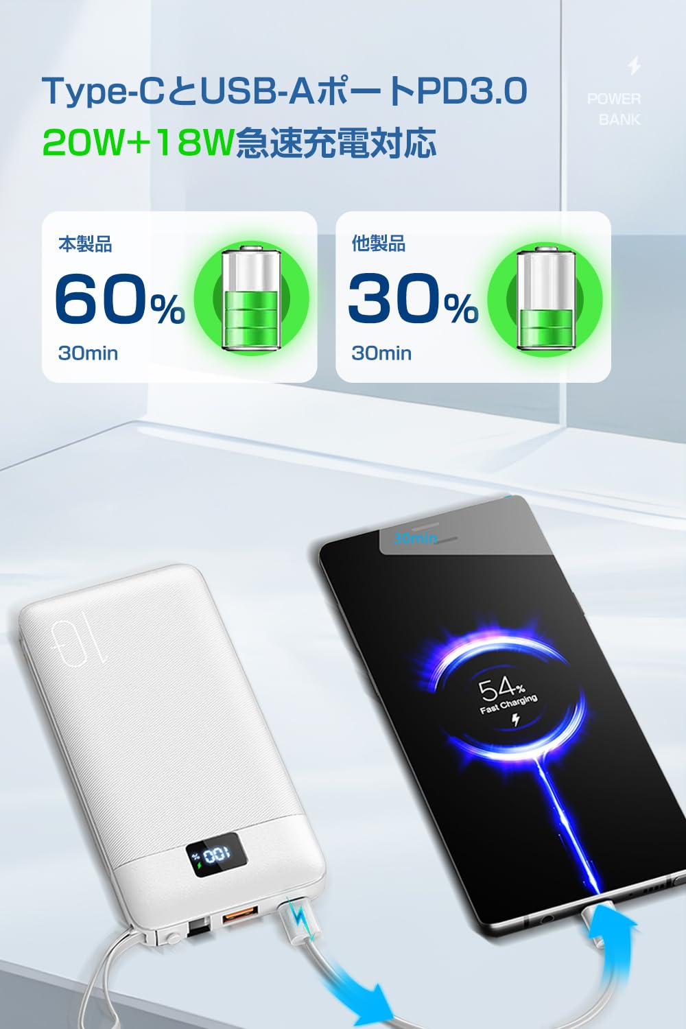 【OMKUY 新登場】モバイルバッテリー 大容量 コンセント 10000mAh 薄型(折り畳みコンセント一体式/パススルー/PD 20W&SCP22.5W急速充電/3本ケーブル内蔵)携帯充電器 持ち運び便利 コンパクト モバイルばってりー PD3.0 携帯バッテリー 軽量 スマホ AC パワーバンク PSE認証 iPhone&Android等対応 (White) | geisha Cat*