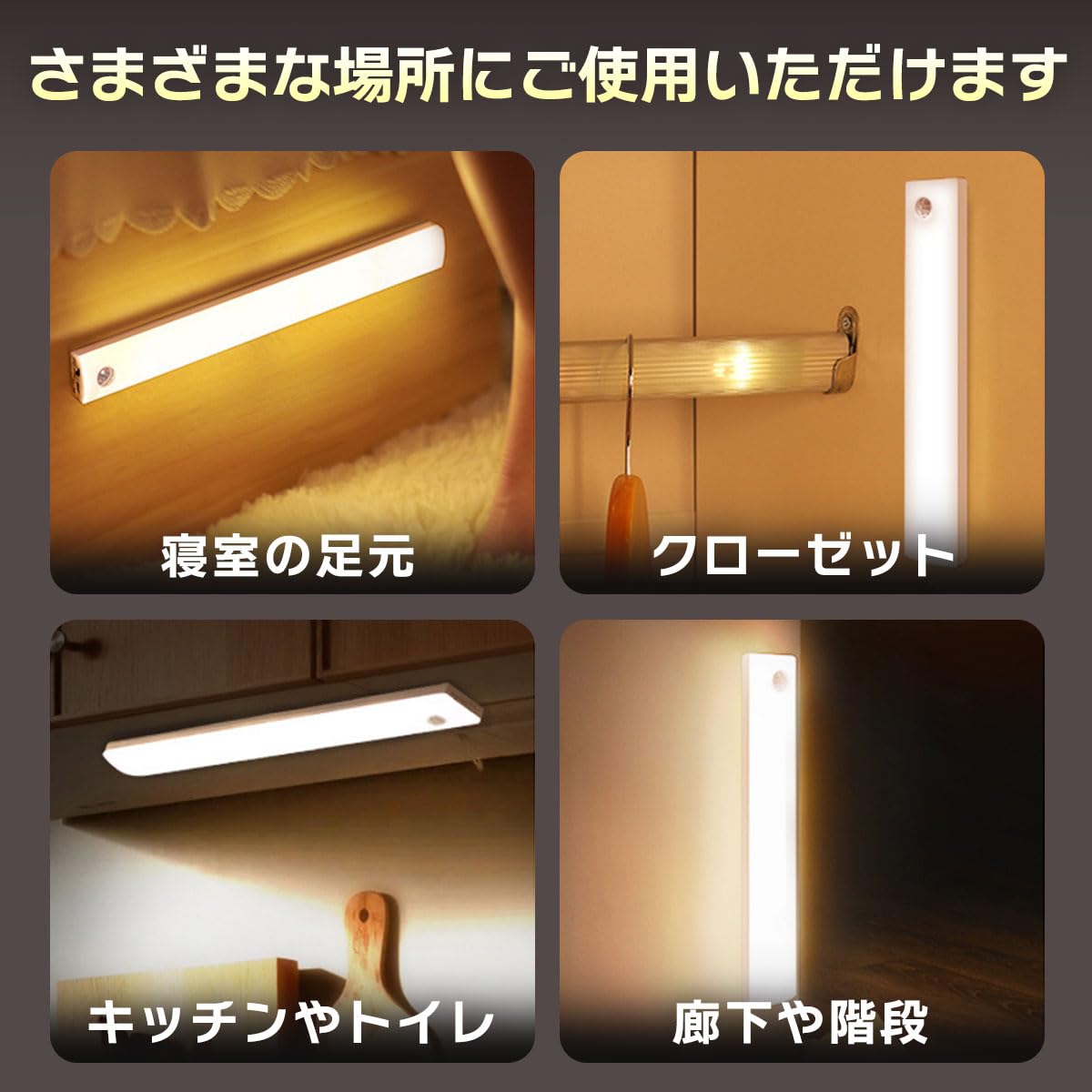 【120°高感度センサー・目に優しいLEDライト】 3~5メートルの範囲内で120度の動きを高感度に検知できるセンサーを備えています。人や動物が近づくと、LEDセンサーライトが自動的に点灯し、静止したり離れると約20秒後に自動的に消灯します。省エネなLEDストリップライトで、夜間や暗い通路、戸棚の中など、明かりが必要な場面で便利です。電源の手間をかけずに使用できます。 センサーライトは、動きを感知し、自動的に光を灯し、均一でちらつきのない超高輝度の照明を提供します。この人感センサーライトは、使い方簡単でとっても便利、クローゼット、キッチン、暗い廊下でのお子様やご老人の安全対策など幅広く使用できます。