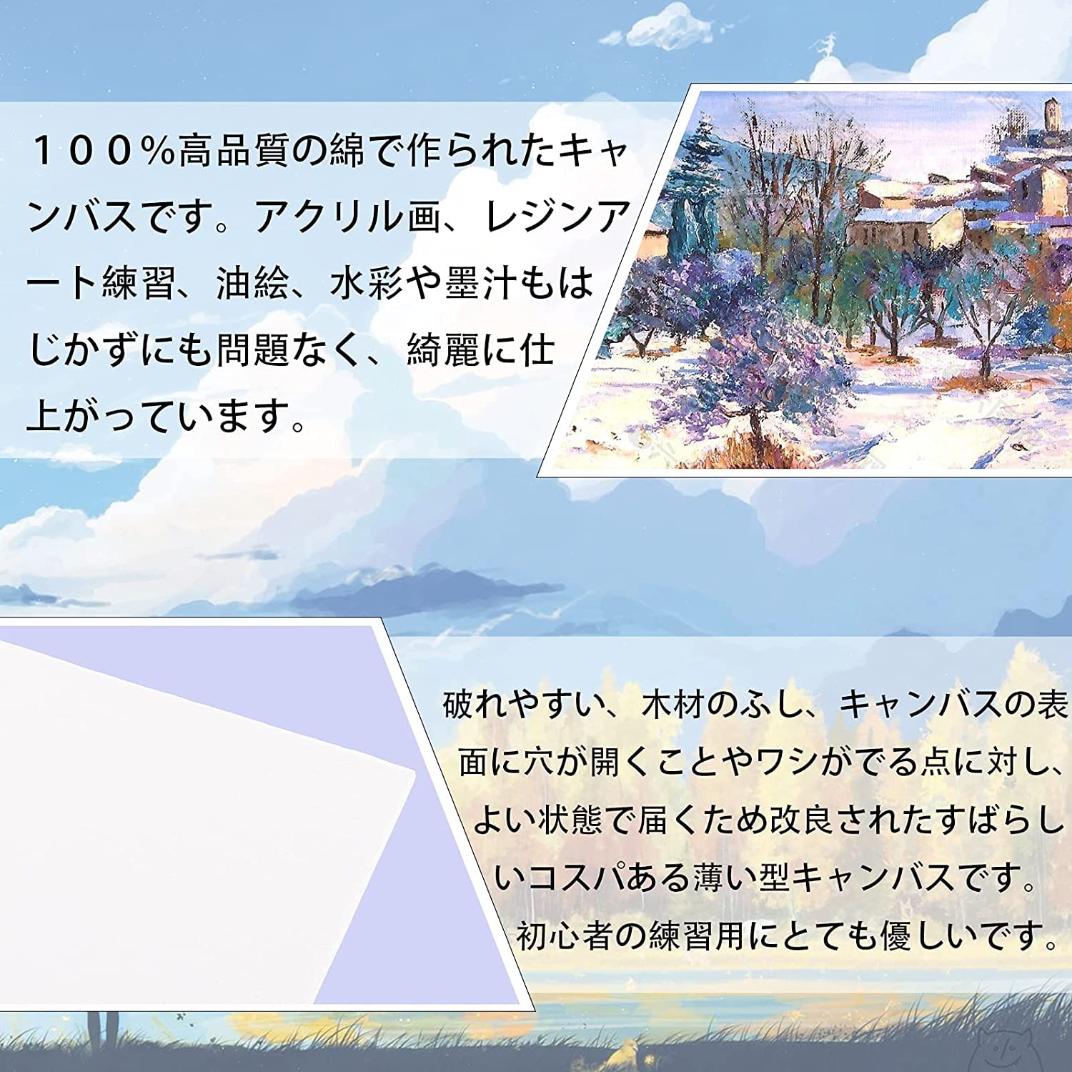 初心者練習:ボードキャンバスは薄手の硬い紙ボードとキャンバス組み合わせ、初心者に練習用のキャンバスです。早速に絵画できます。