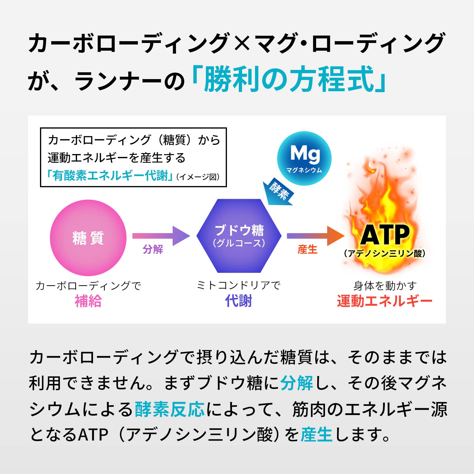 【35kmの壁の克服に】レース後半のパフォーマンスダウンをケア! マグネシウムは筋肉の弛緩(伸ばす)に使われるミネラル。カーボローディングに加えマグ・ローディングを併用することで、後半の粘りを。