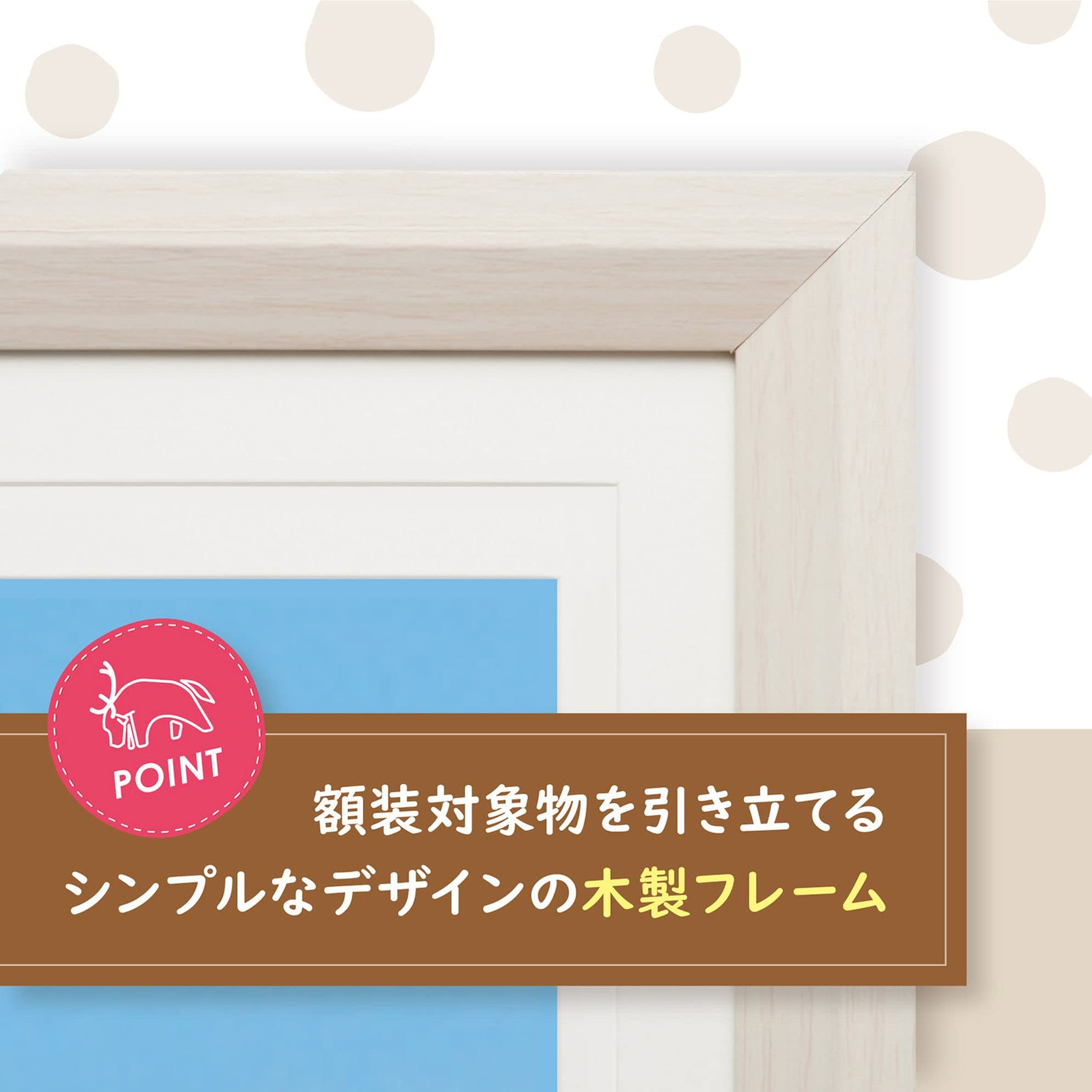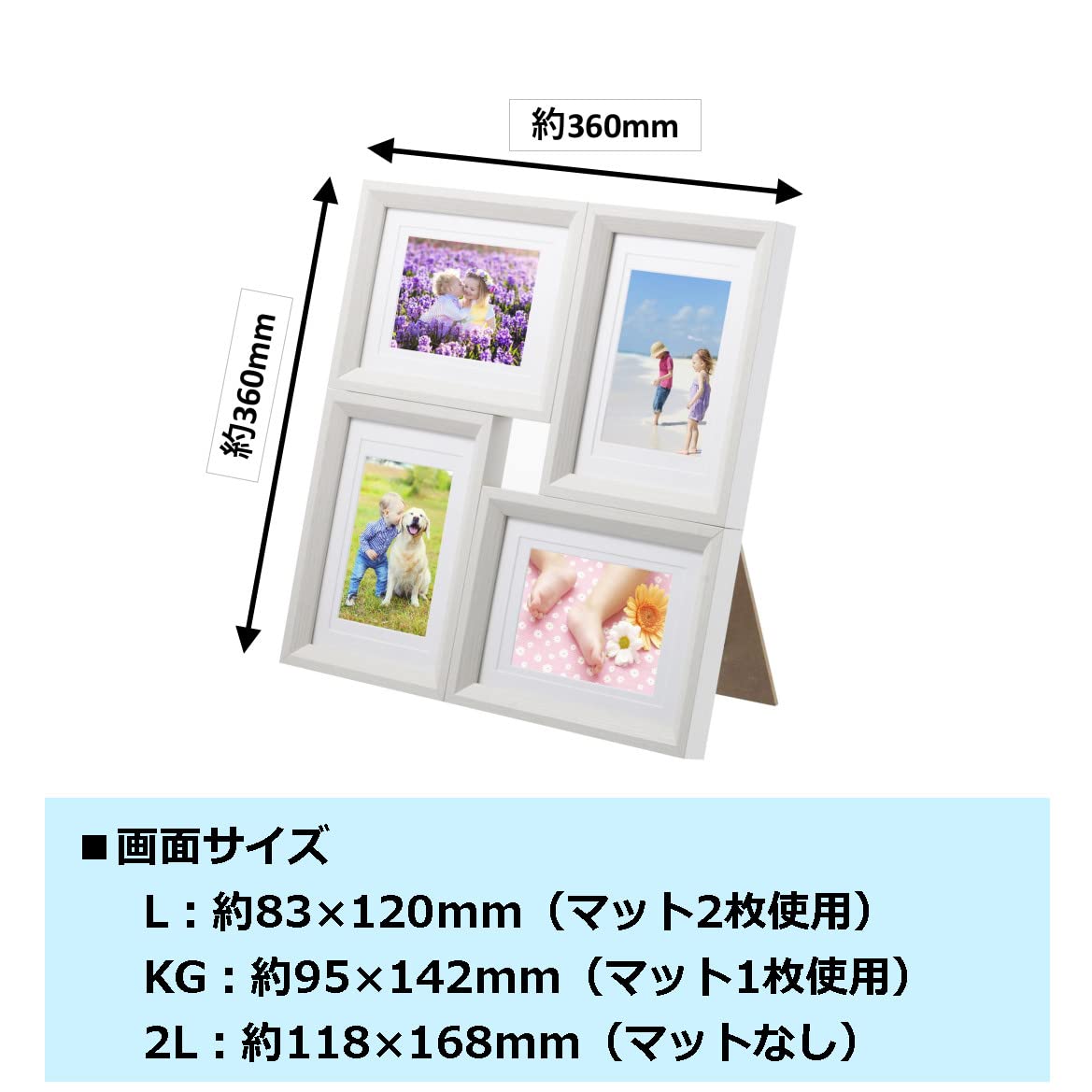 フレーム材質 : 木製、額縁外寸法 : 約W360×H360×D20mm、画面サイズ : L : 約83×120mm(マット紙)、 KG : 約95×142mm(マット紙)、 2L : 約118×168mm(マットなし)、前面板 : PS板、重 量 : 約980g