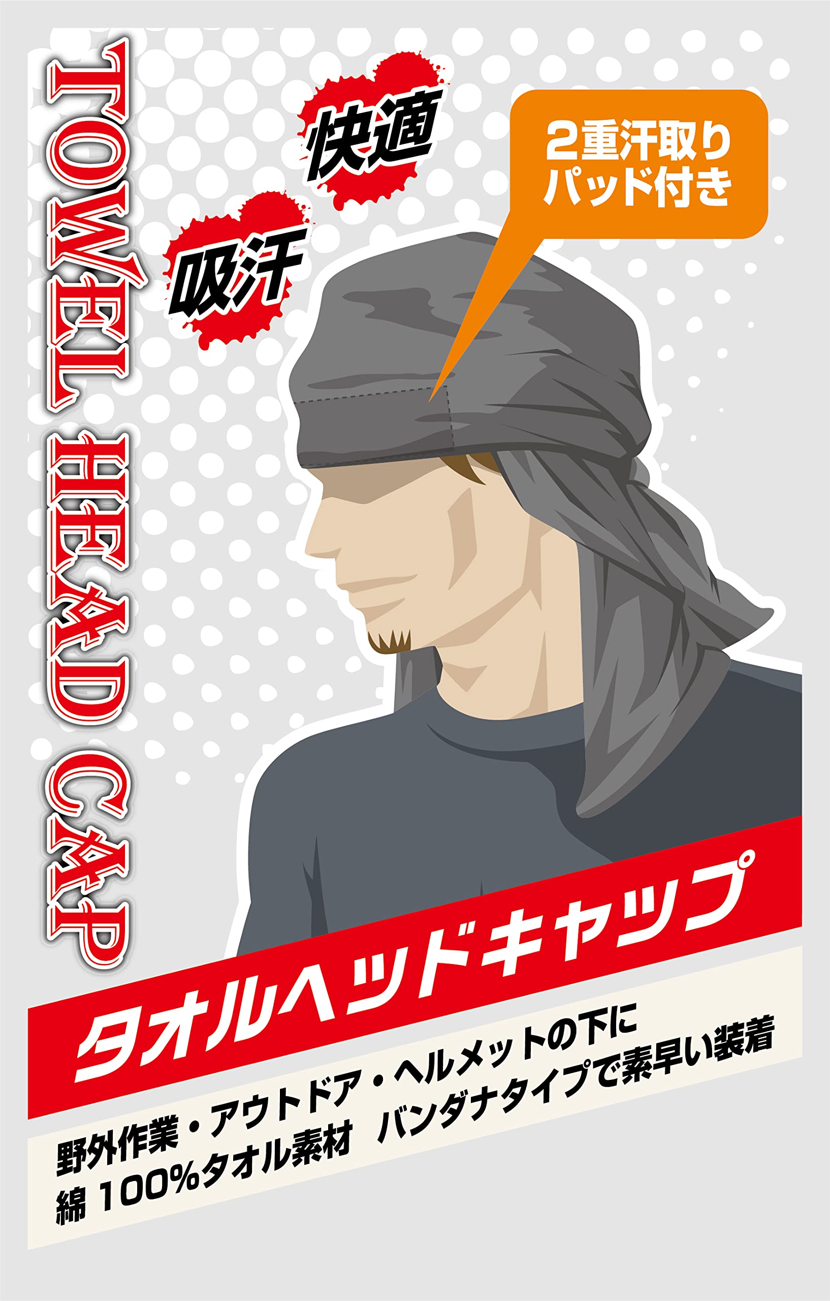綿100%のタオルヘッドキャップ。タオル素材のため、汗を取り、吸水性抜群です。ひたい部分には2重汗取りパッドを装備。バンダナタイプで素早く装着できます。野外作業・アウトドア・レジャーなどいろんな場面で活躍。ヘルメットの下に被って使用できます。ほこりや直射日光から頭部・首・襟元を守ります。