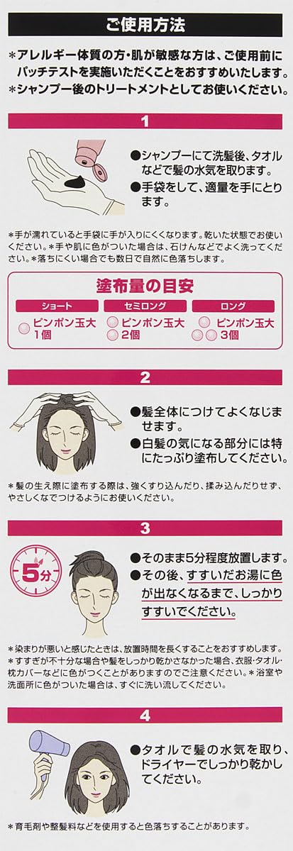 ①●シャンプーにて洗髪後、タオルなどで髪の水気を取ります。●手袋をして、適量を手に取ります。\n②●髪全体につけてよくなじませます。●白髪の気になる部分には特にたっぷり塗布してください。\n③●そのまま5分程度放置します。●その後、すすいだお湯に色が出なくなるまで、しっかりすすいでください。\n④●タオルで髪の水気を取り、ドライヤーでしっかり乾かしてください。\n