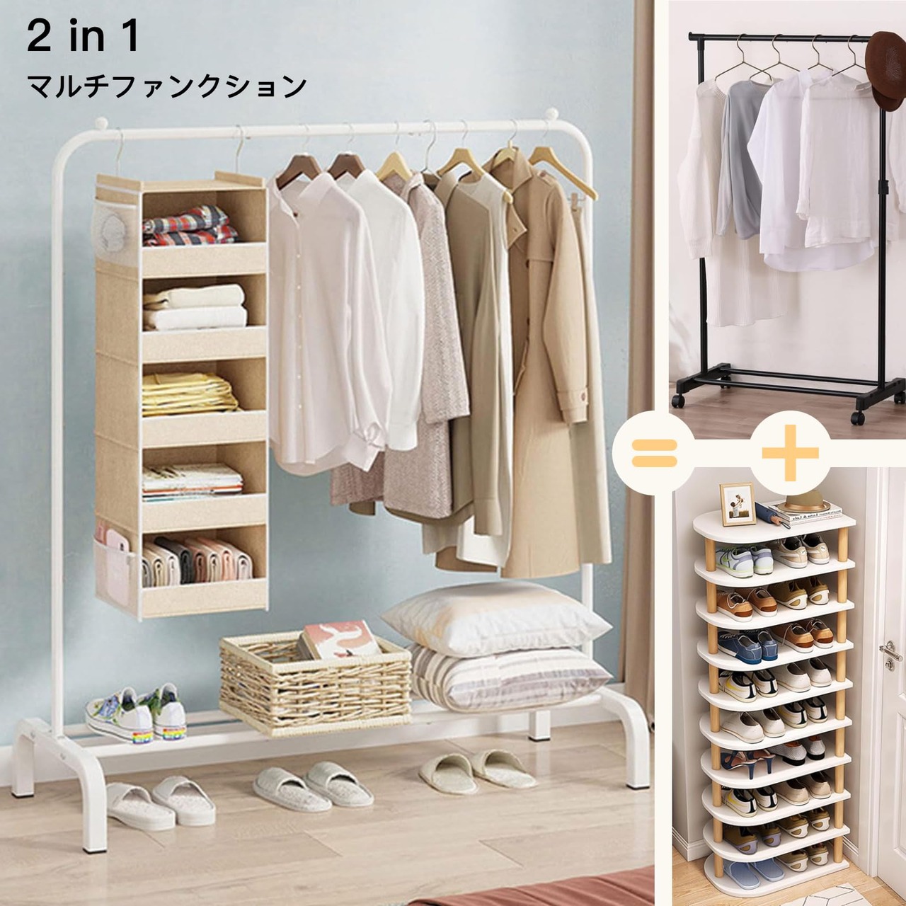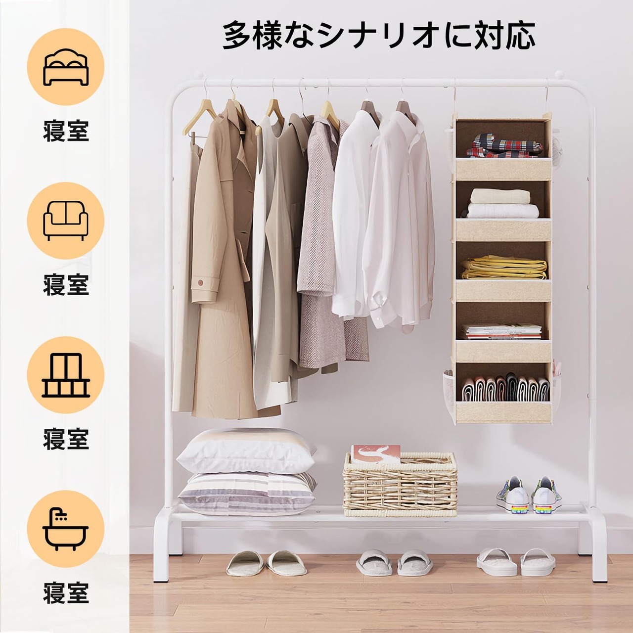 【スペースを活用】: 洋服掛け 狭いお部屋でもスペースを効果的に活用して、靴、帽子、衣類などを整理整頓できます。ロングコートやワンピースなどの長い衣類も十分に収納可。