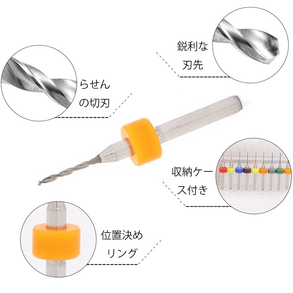 セット内容:極細ドリルビット10本セット(収納ボックス付き)、サイズ:0.6-1.5mm(0.6、0.7、0.8、0.9、1.0、1.1、1.2、1.3、1.4、1.5mm)、カラー:カラフル(色ランダム)。