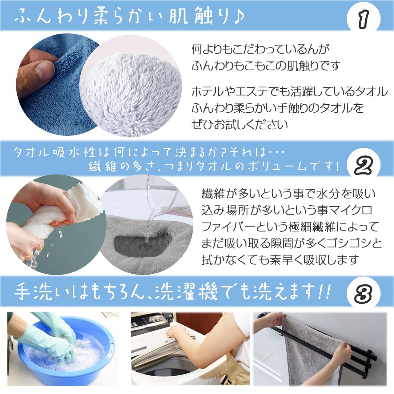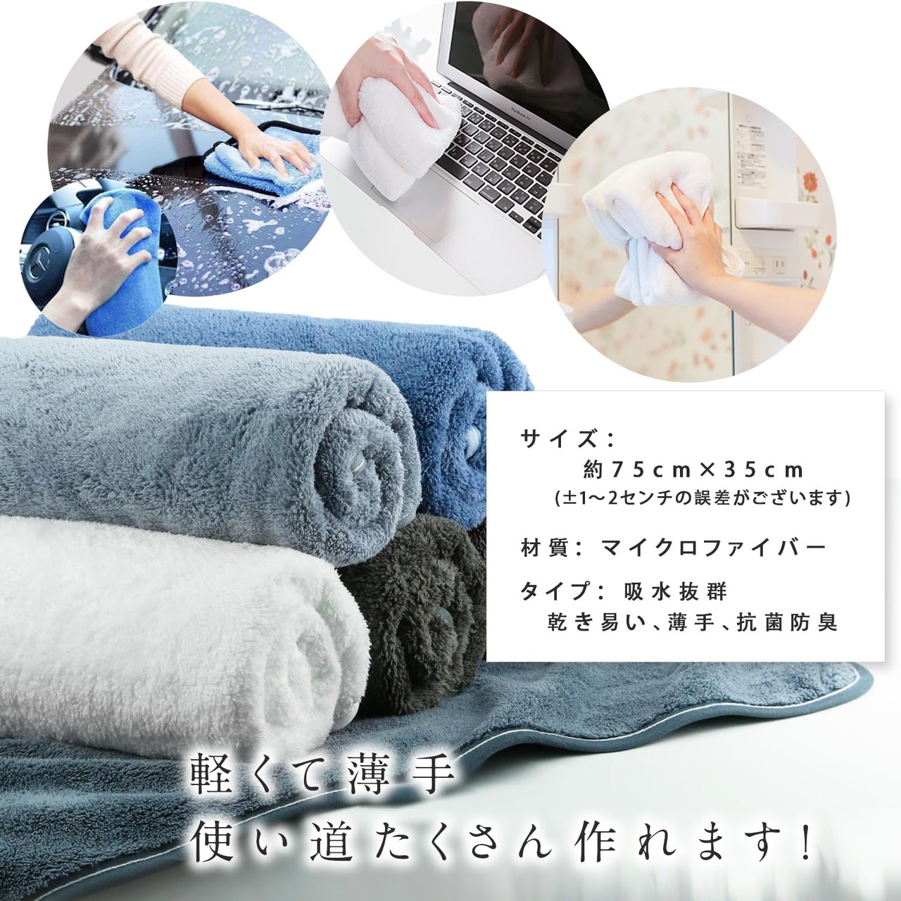 【カラフルなタオルであなたの生活を彩ります】 ホワイトかブルー、からの暗めのグレー、色の配色的には涼しい色合いを選び、丁寧に染めあがりました。レギュラーサイズと軽量化のデザインから家庭用はもちろん、出張や旅行にもピッタリです。お風呂上り、ジム、美容院、プールなどいろんなシーンでは大活躍します。
