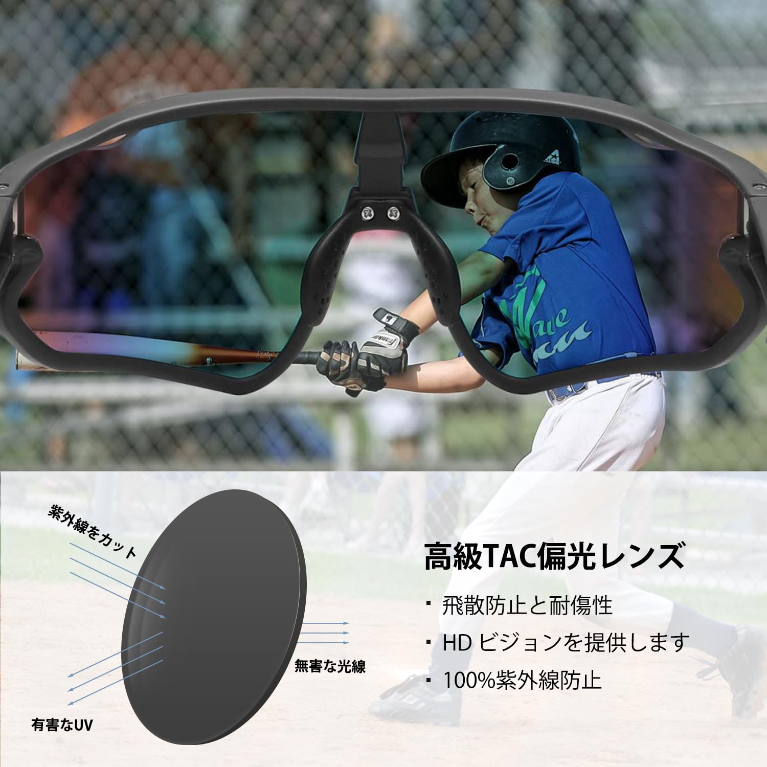 100%UVカットレンズを使用しており、紫外線から子供の目を保護します。長時間の屋外活動や野球の試合中でも、眩しさや光の反射を軽減します。