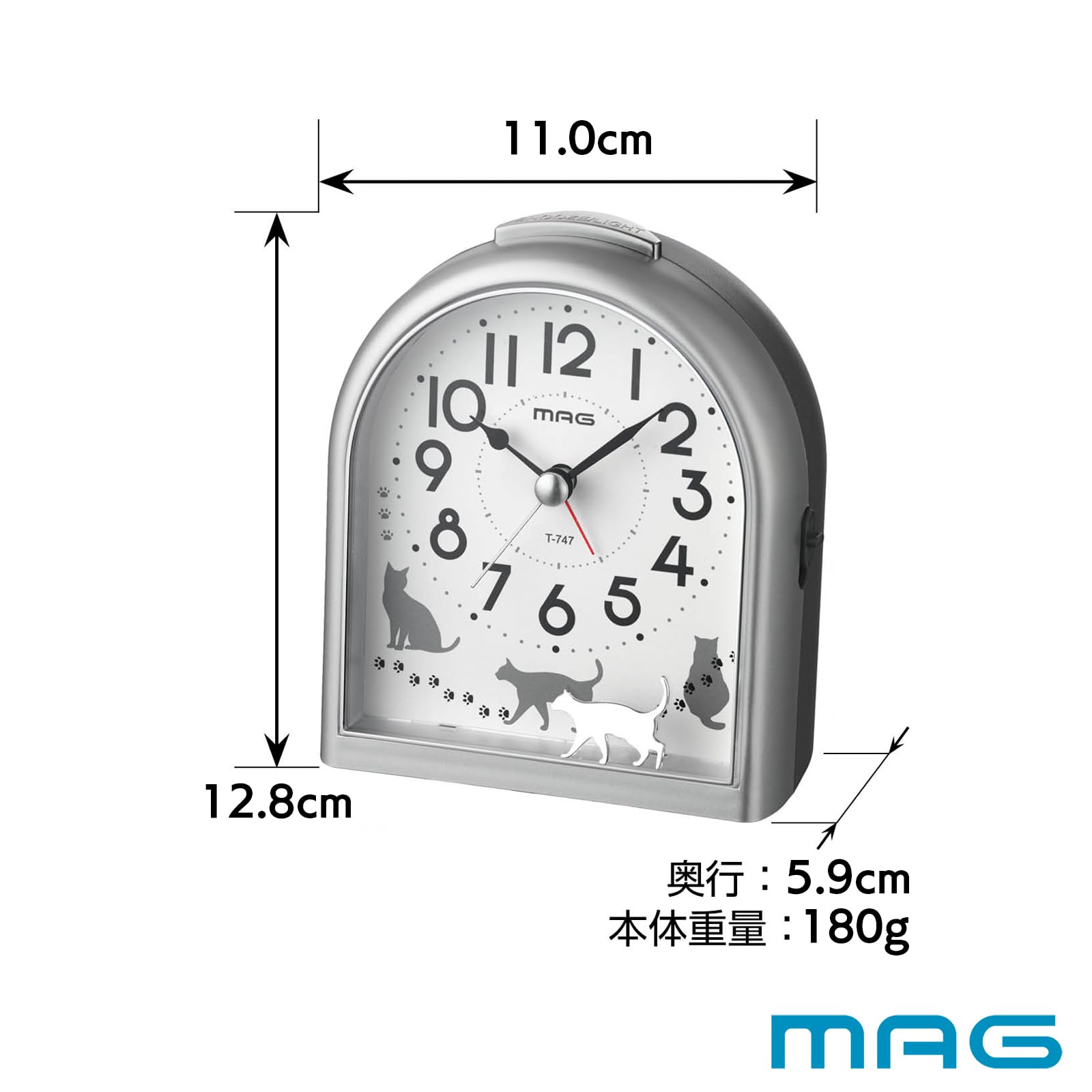 MAG(マグ) 目覚まし時計 置き時計 アナログ ねこ ネコ 動物 かわいい 子供 静音 連続秒針 電子音 アラーム スヌーズ ライト シルバー ミグレイト T-747 SM-Z ノア精密