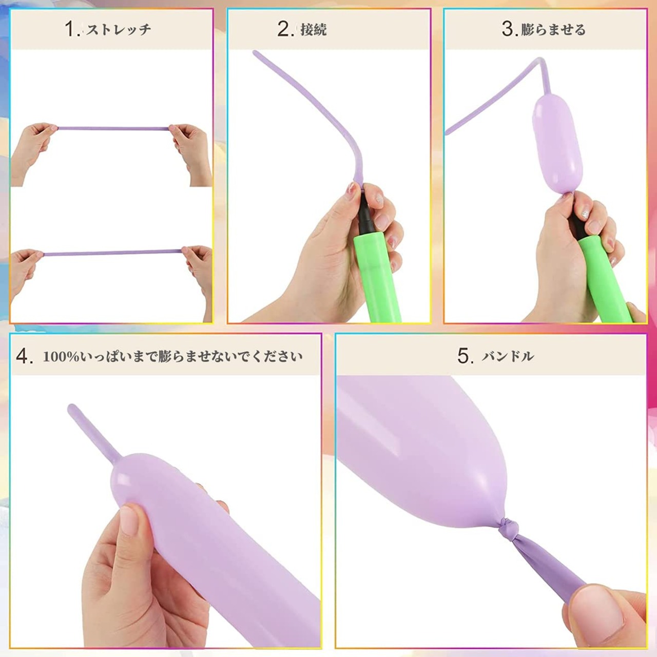 【注意】金属製の長い風船は口で膨らませることが難しいため、バルーンポンプを使用して膨らませることをおすすめします。 バルーンの保存期間は1~2日です。