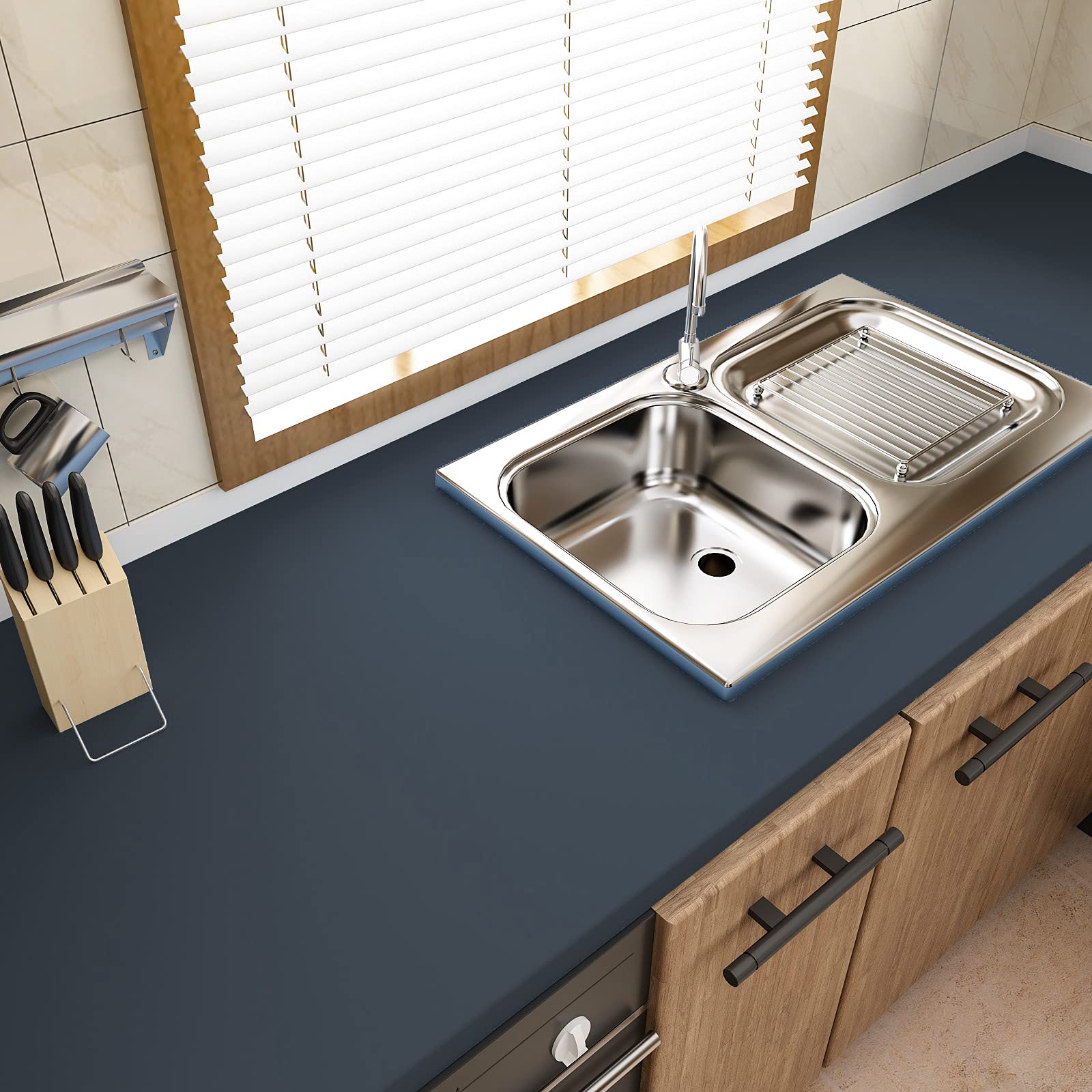 【使いやすい】ダークブルーのビニール製壁紙シールは、接着剤がいりません。剥がして貼り付けるだけです。壁紙の裏側にあるグリッド線はカットしやすく、とても便利です。 キャビネット、カウンタートップ、棚に適しています。または、お好みな清潔で乾燥した平らかな表面に貼り付けることができます