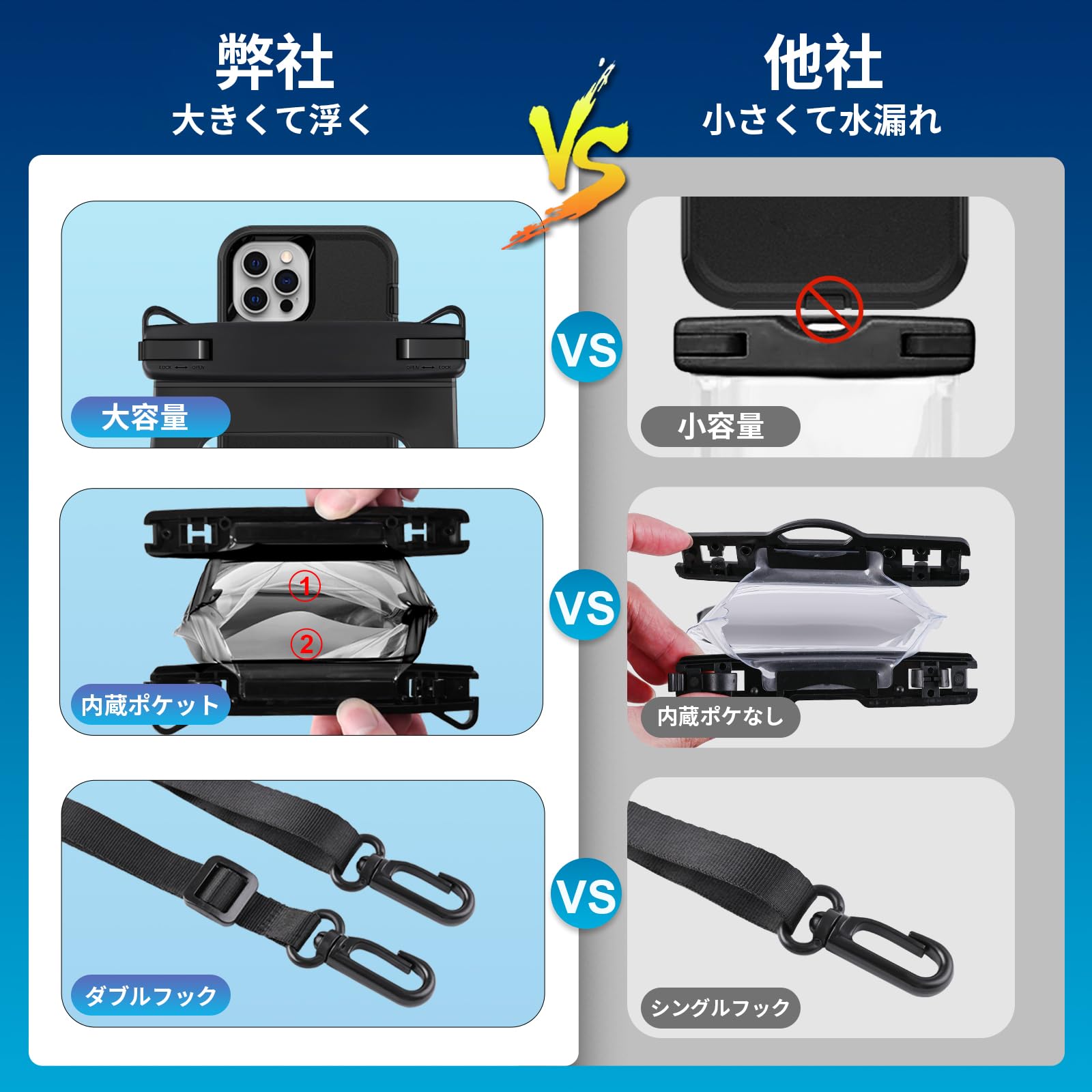 【超大容量】この大容量スマホ防水ケースの中に特別な収納ポケットが付いており、スマホを入れてから、余ってる大きなスペースがあり、イヤホン、カード、メイキングセット、現金、パスポート、鍵、モバイルバッテリー、メガネ、サングラスなどいろんな品物が余裕に入れて、水係の活動をするには最適な選択です。
