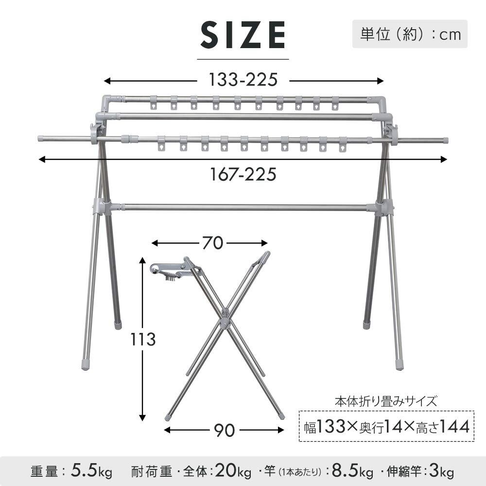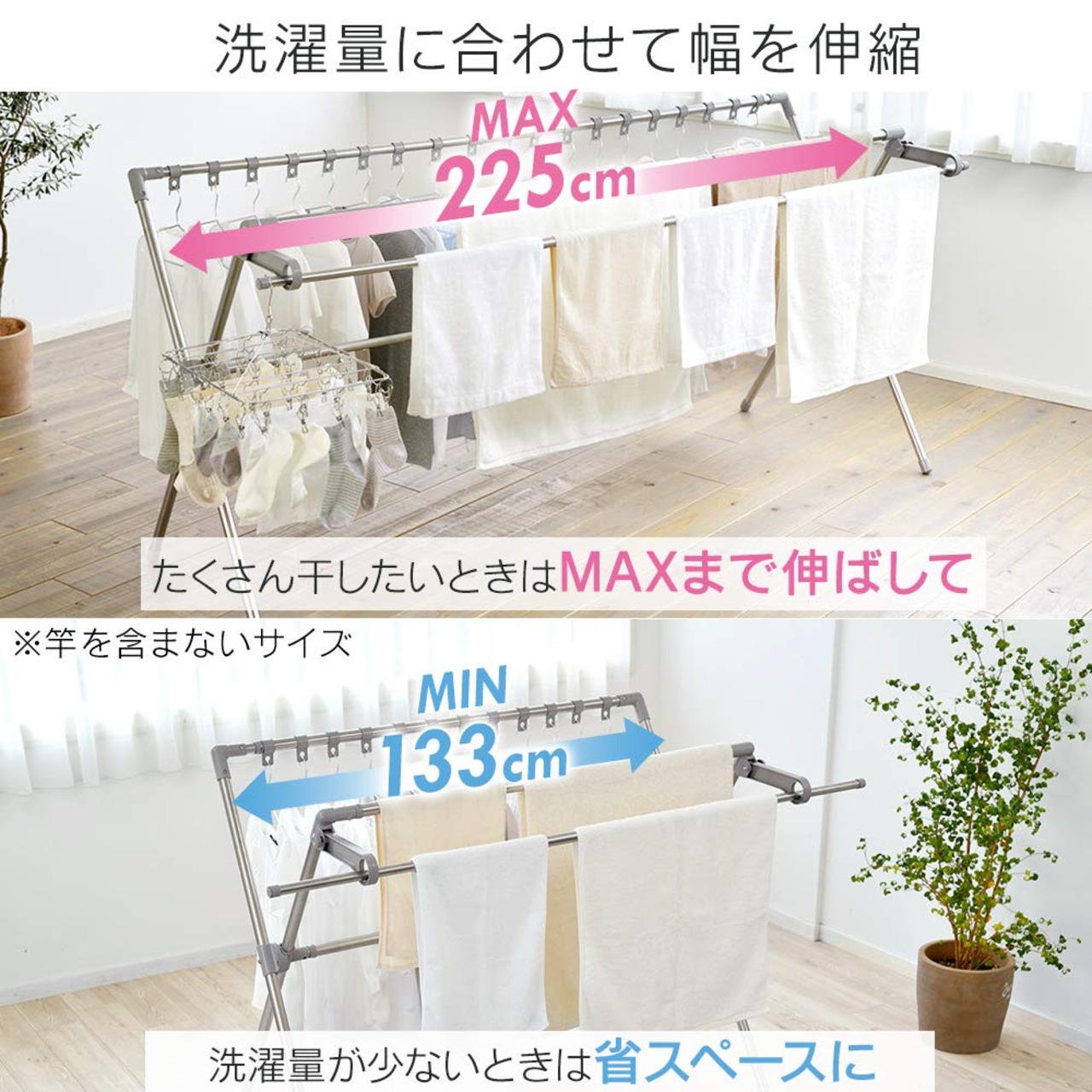 物干し本体と竿、それぞれに伸縮可能。