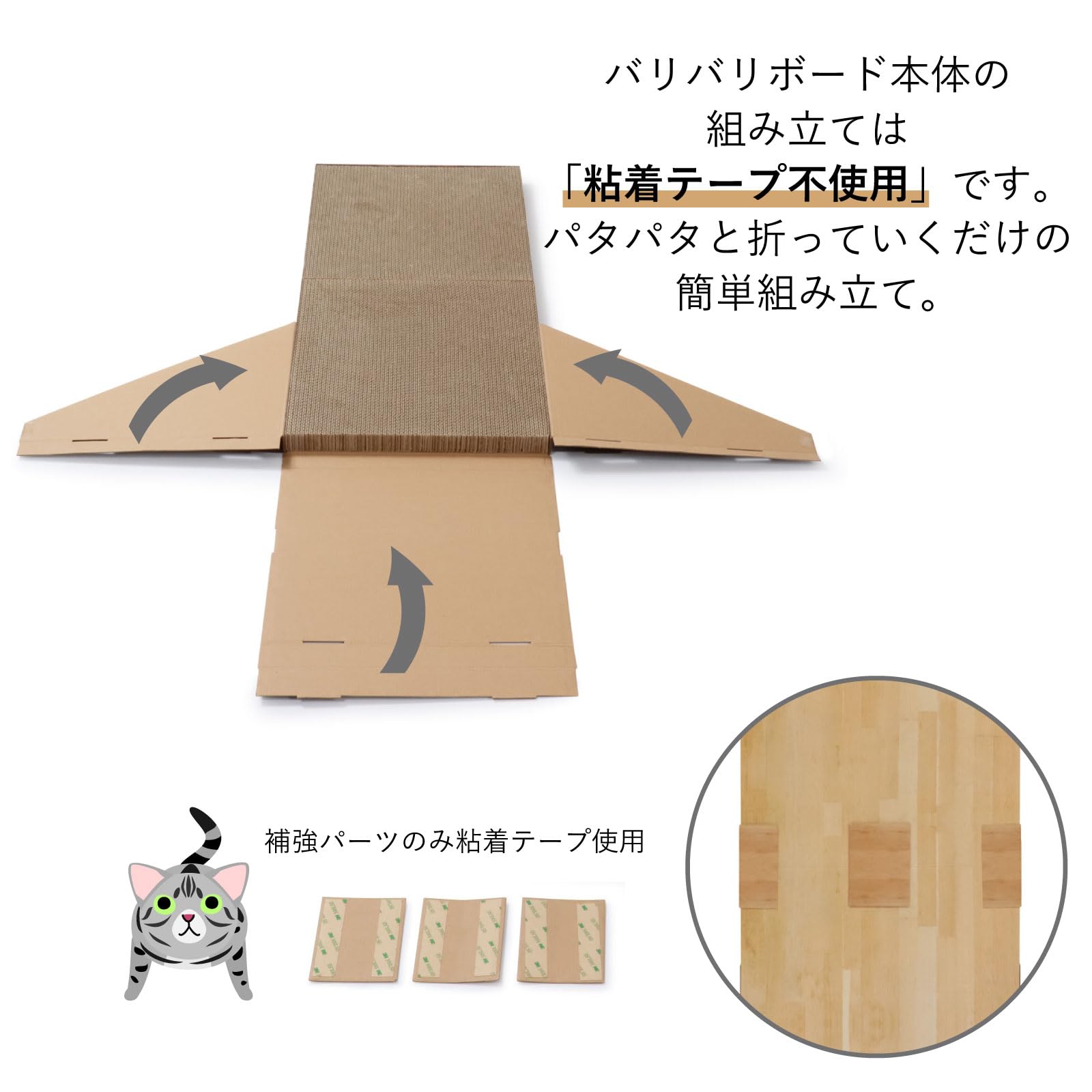 2つ折りになった背板部分のつめとぎを合わせるのに使用する粘着テープは強力タイプを使用することで、しっかりと補強します。
