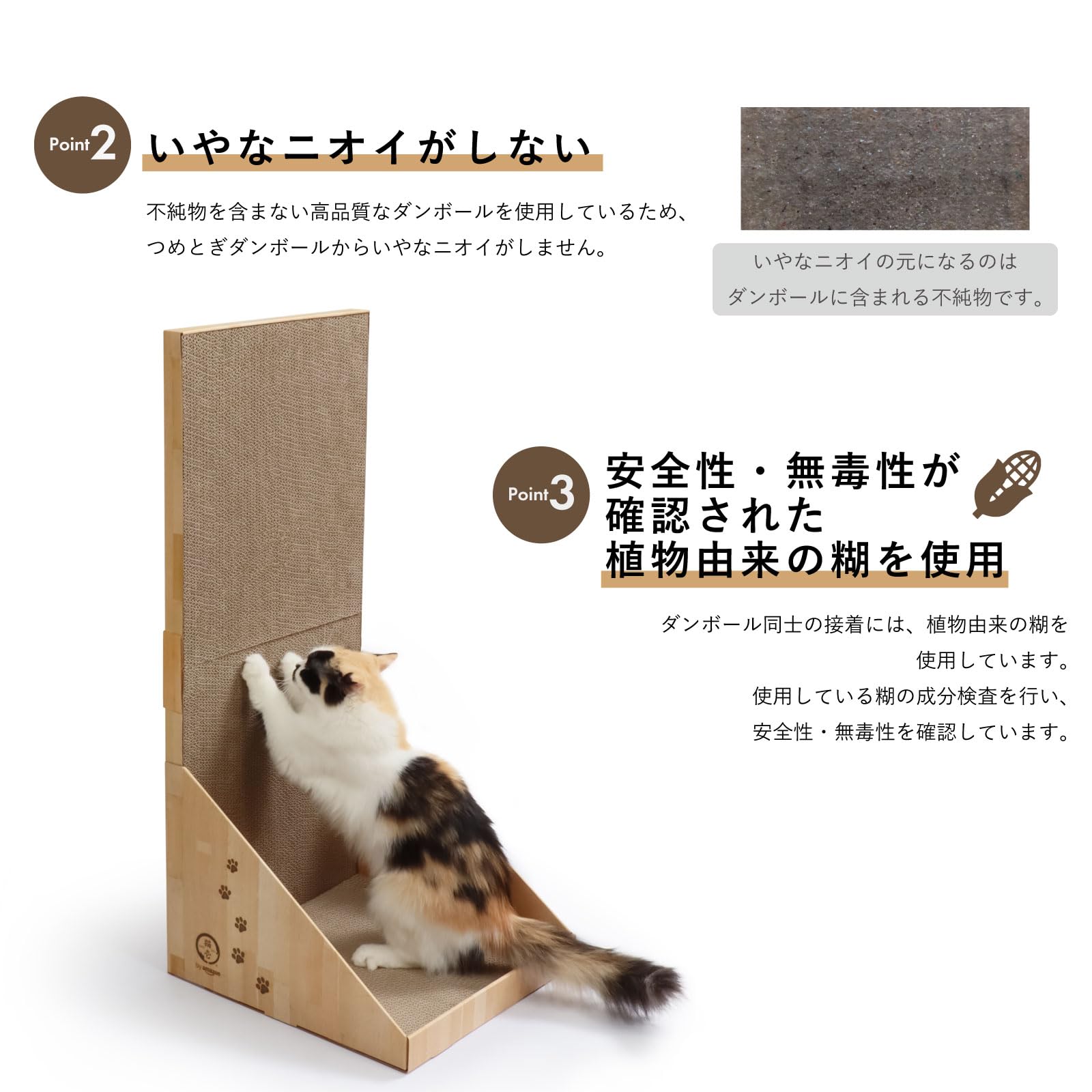 【こだわり抜いた原材料】つめとぎ部分に使用しているダンボールは、原料の100%が紙。内10%はニュージーランド産原パルプ紙を使用。大切な猫に使用するつめとぎなので、品質にはとことんこだわりました。原料の品質が良いため、とぎくずも出づらくなっています。ダンボールを貼り合わせる糊は植物由来の糊を使用しています。