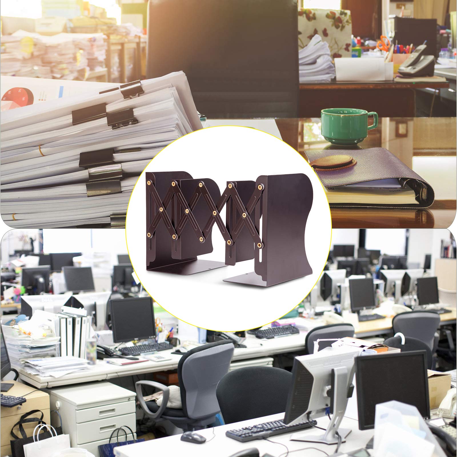 ALIOBC 本立て 伸縮自在 ブックエンド 倒れない 金属製 卓上本棚 仕切りスタンド 雑誌 書類 新聞ファイル ひきこみ式の棚 事務用品 文房具 学習 書斎 子供部屋 オフィス 多機能 おしゃれ ブラウン
