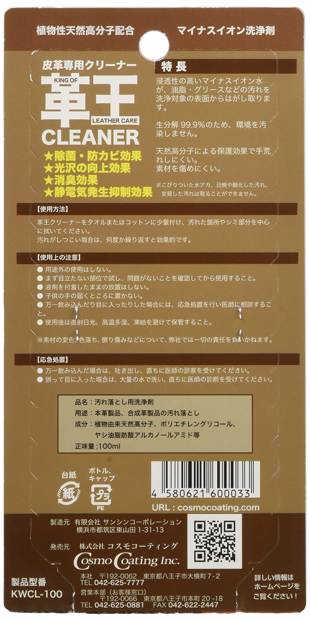 用途:本皮製品、合成革製品の汚れ落とし 成分:植物由来天然高分子、ポリエチレングリコール、ヤシ油脂肪酸アルカノールアミド等 正味量:100ml