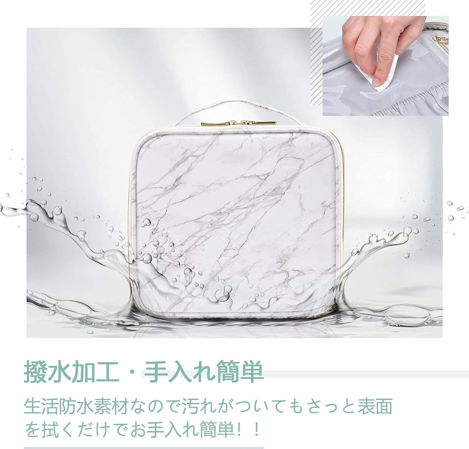 プロ仕様大容量かつ優れた緩衝性、レイアウトも自在に変更できるメイクバッグ。デザインは大人の女性に人気の大理石風。ゴールドの金具が相まって、高品質PUレザーを採用して、手触りが柔らかくて、高級感が漂います。撥水加工ましたので、お風呂、プール、温泉など水濡れし場所でもご安心に使用できます。そして、外部素材は埃を防ぐ、清潔も簡単です。材質: PU皮革、ナイロン、EVA、プラスチック 製品寸法: 約25(長さ)×23(幅)×9cm(高さ) パッケージ内容:プロ化粧パック*1 仕切り板*6(長め*1 中*2 小さめ*3) 右側にジッパー付きのポケットx1、化粧鏡、アイシャドウ,スマホ、充電ケーブルなど収納は最適です。