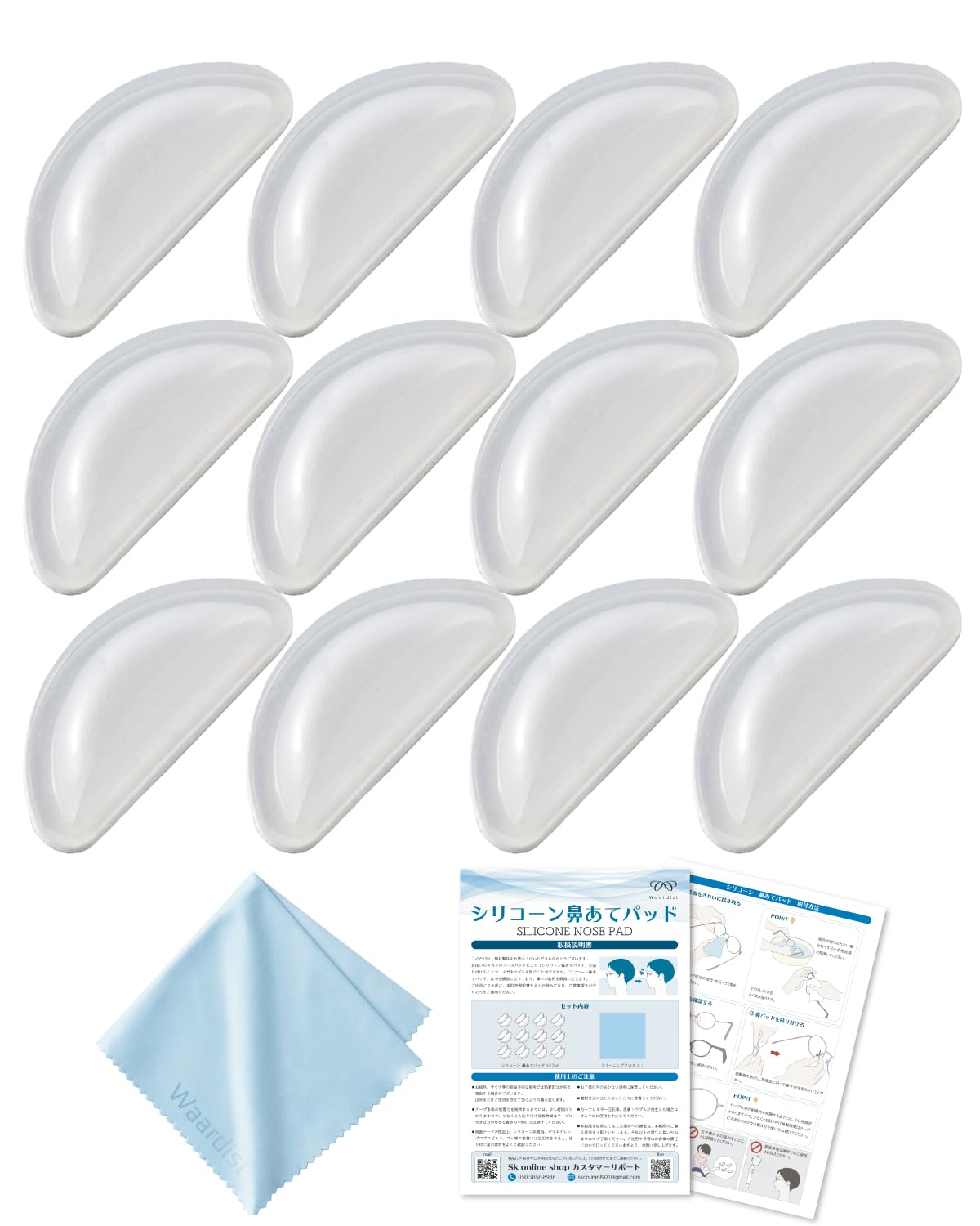 【サイズ/セット内容】 鼻パッド 縦14.6mm 横6.4mm 厚み3.5mm クロス 20cm×20cm 、 鼻パッド 12セット(24個) 、 クロス 1枚、 取扱説明書 1枚