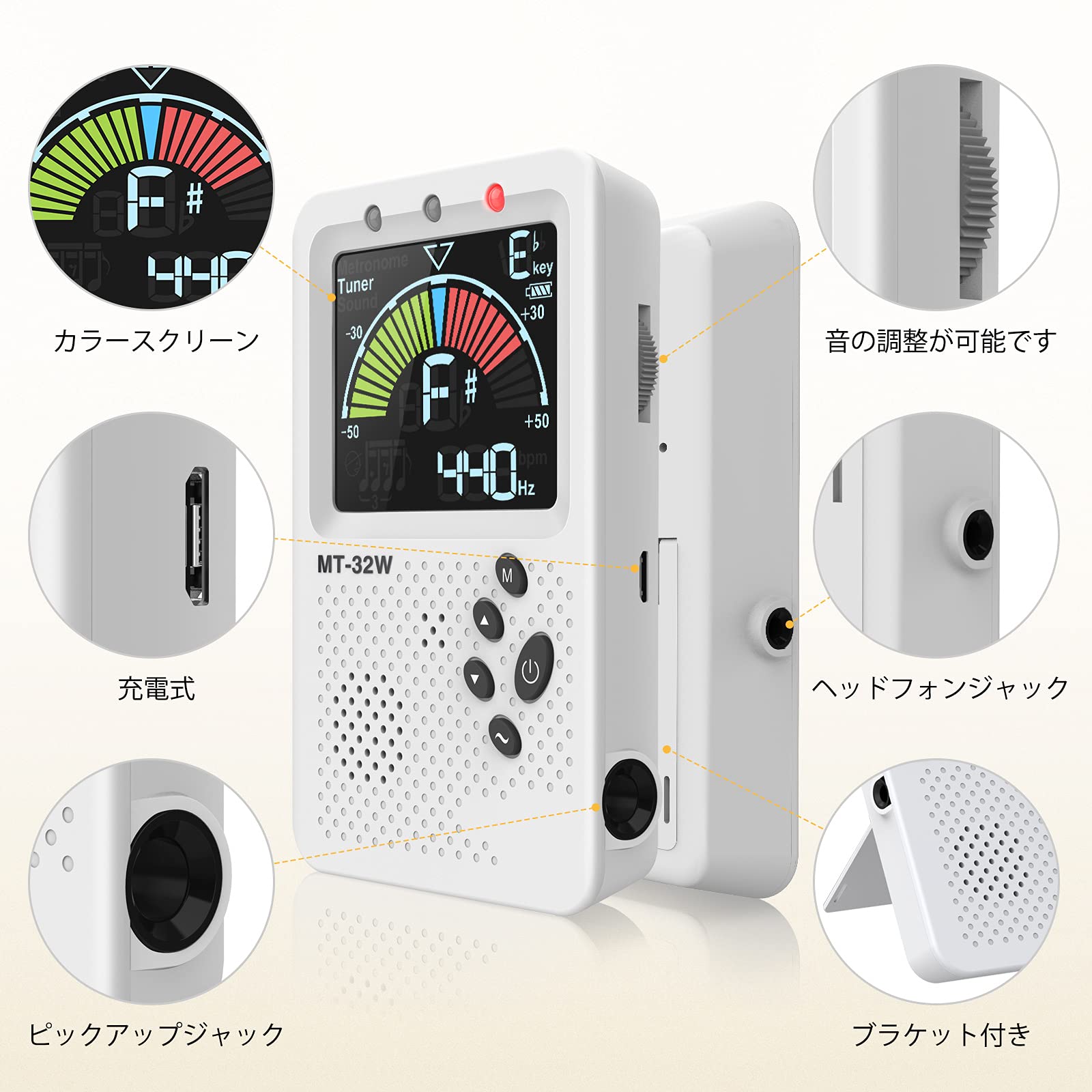 LEKATO チューナー メトロノームモード付 3in1デジタル ギター/ベース/ピアノ用 クリップマイク付 軽量 メトロノーム ピックアップクリップ ボーカルデジタルビートモード LEDカラーディスプレイ USB充電 多機能チューナー (ホワイト) | geisha Cat*
