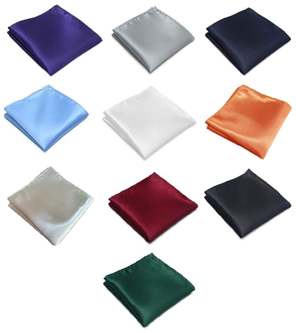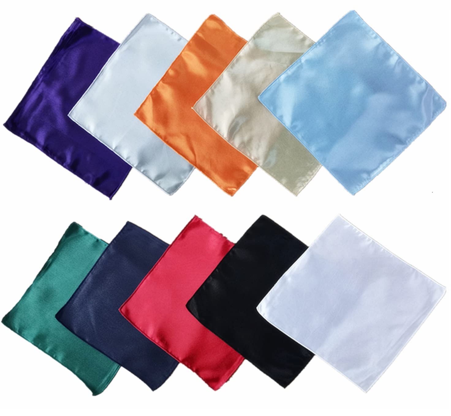 【10色セット】ブラック、ネイビーブルー、ダークパープル、ホワイト、ライトグレー、ライトシャンパン、オレンジ、ダークグリーン、ライトブルー、ダークレッド。ハンカチには様々な色があり、様々なスーツに合わせることができます。