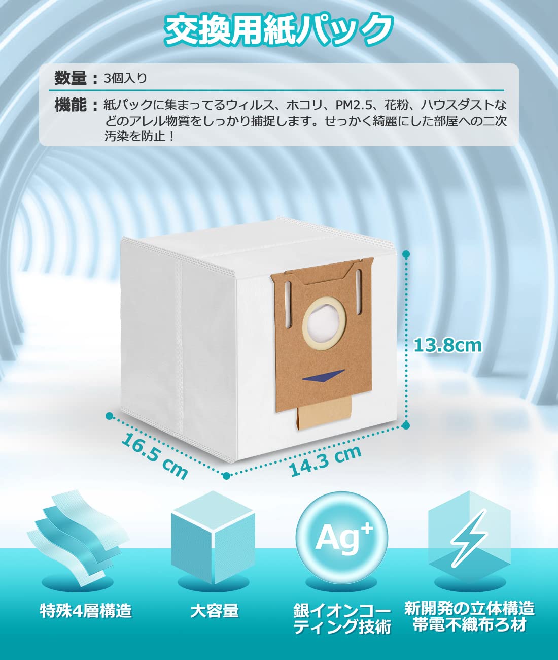 【パッケージ内容】 ロボット掃除機 用 ダストフィルター ×3、紙パック×3、サイドブラシ×3セット、メインブラシ×1、お手入れ用ブラシ×1個、日本語取扱説明書×1