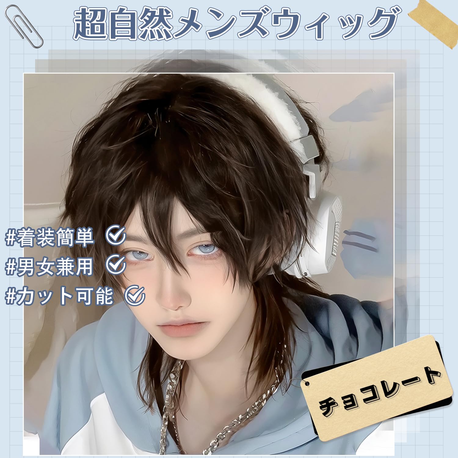 ■かっこいい!ウルフフルウィッグ■髪上部は丸みをつけたマッシュルームカット、下部にレイヤーを入れることで襟足部分を軽く仕上げるヘアスタイルです。襟足部分のレイヤーの様子が狼の毛先に似ています。あまり重くなくて、イケメンな雰囲気がいっぱい!
