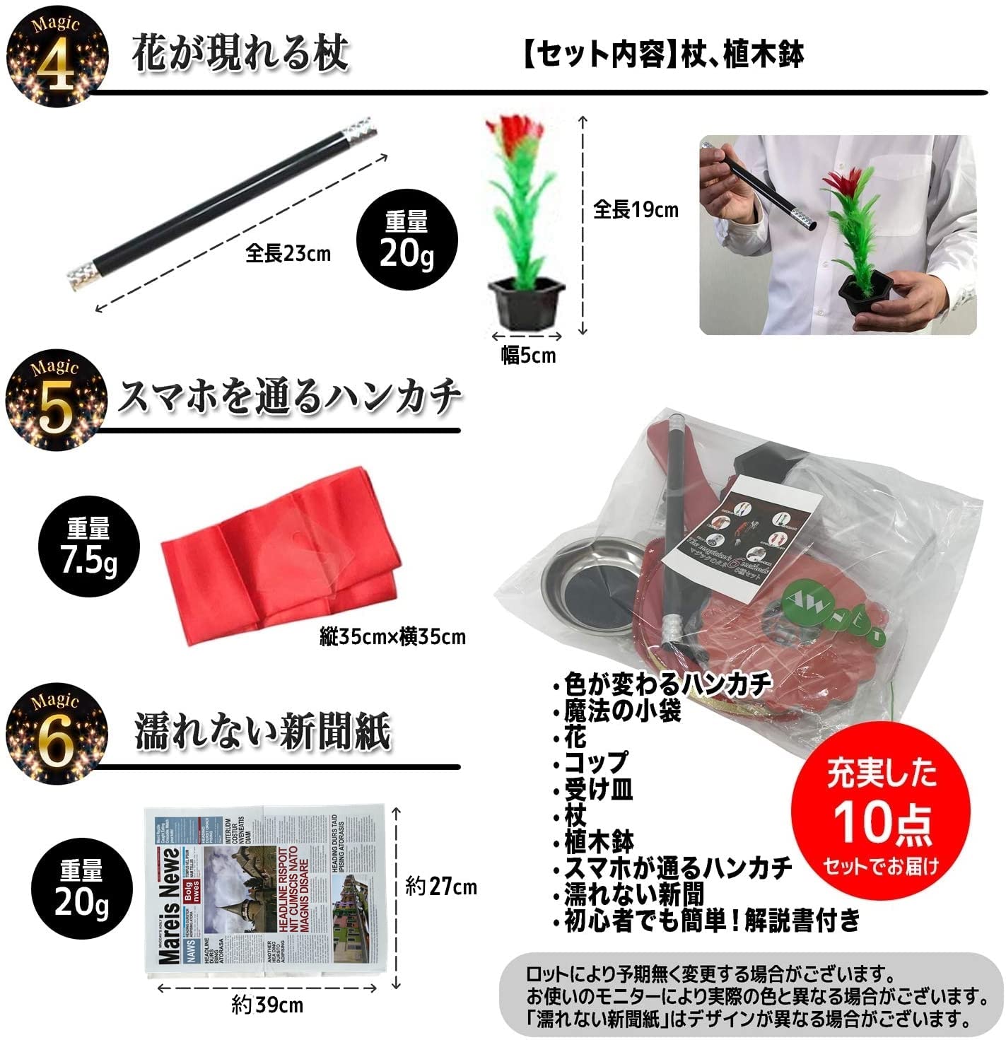 【セット内容】■花が現れる杖:全長23㎝(花の高さ19㎝、鉢の幅5㎝) 重さ20g ■色が変わるハンカチ:伸ばしきった状態で約70㎝ 重さ10g ■魔法の小袋:28㎝×15㎝ 重さ150g ■スマホを通るハンカチ:35㎝×35㎝ 重さ7.5g ■濡れない新聞紙(英字新聞風):54㎝×39㎝ 重さ20g ■通過するコインのお皿:直径19㎝ 重さ18g