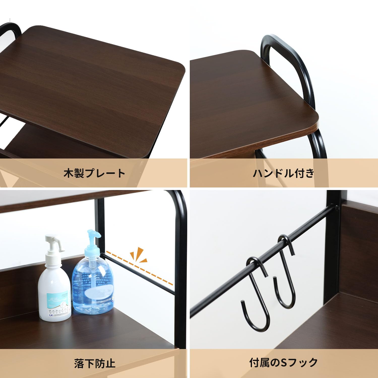 【キャスター付きで移動便利】移動に便利なキャスターとハンドル付きなので、キッチンラックは収納したままで、必要なところにまとめて運べます。4つのキャスター付きで360°自由に回転し、方向転換もスムーズ、部屋の掃除などにもとても便利です。ロック可能なキャスター2つ配置され、所定の位置に固定し、安定性を高めるのに役立ちます。